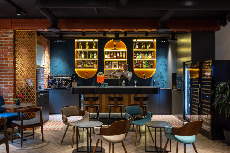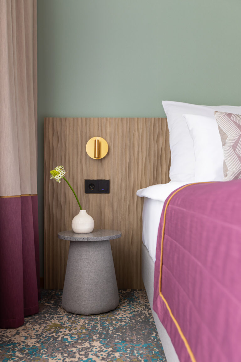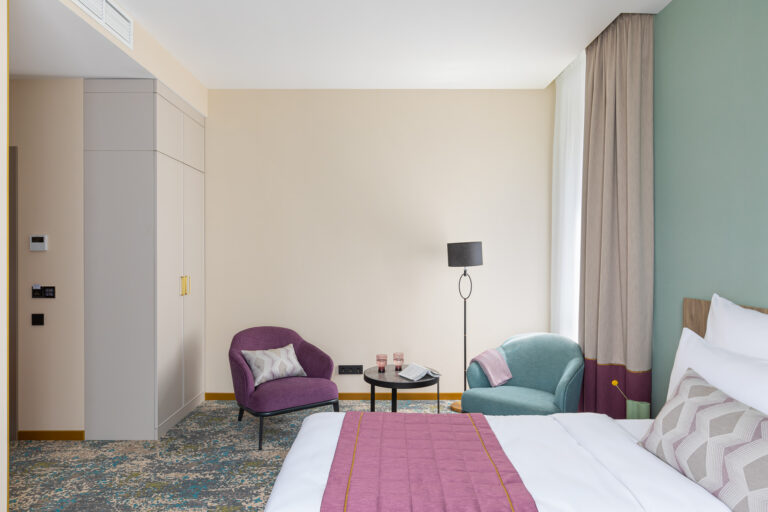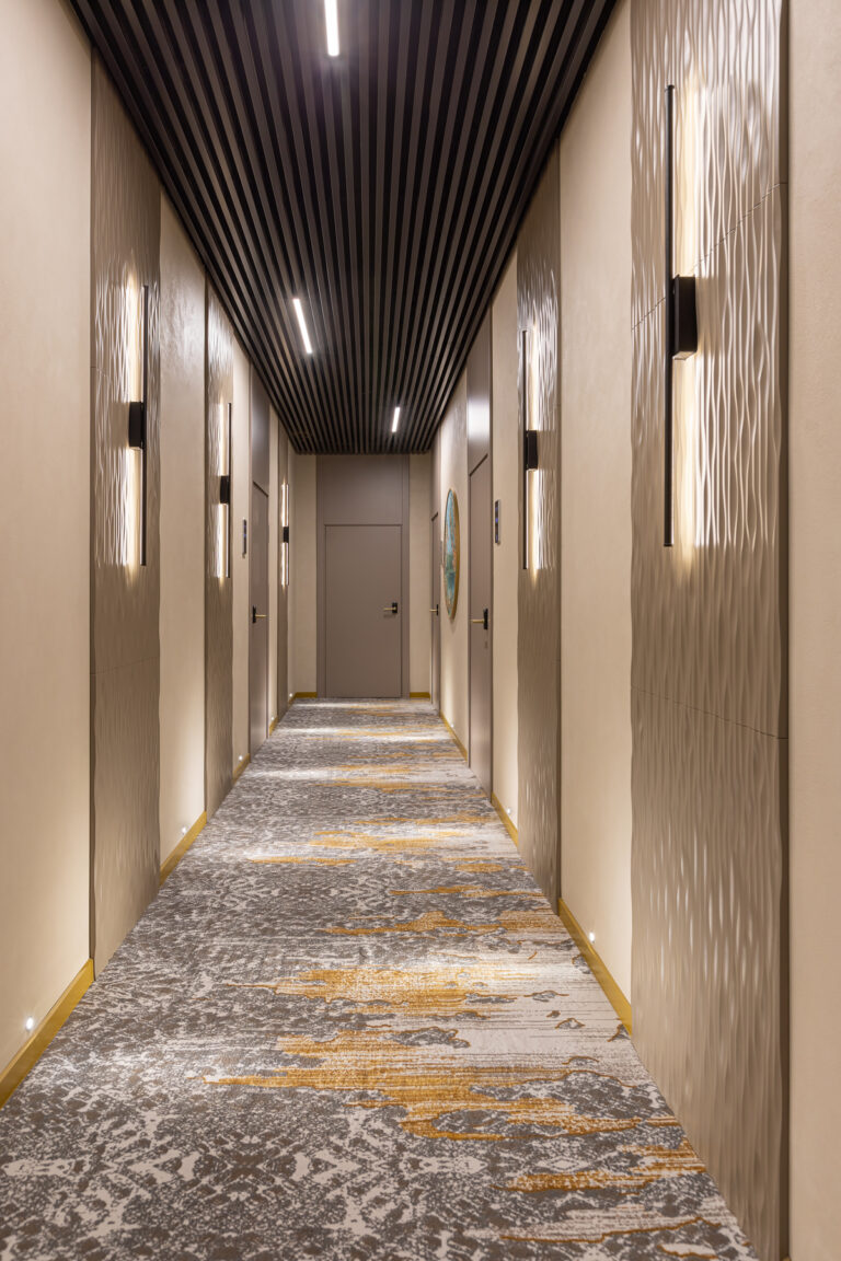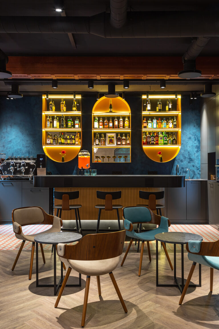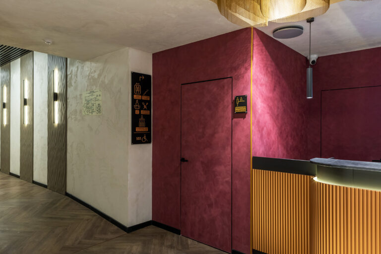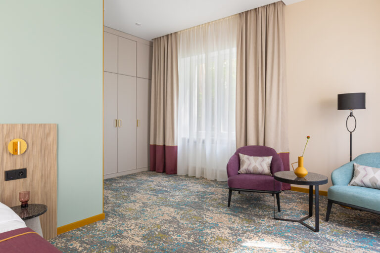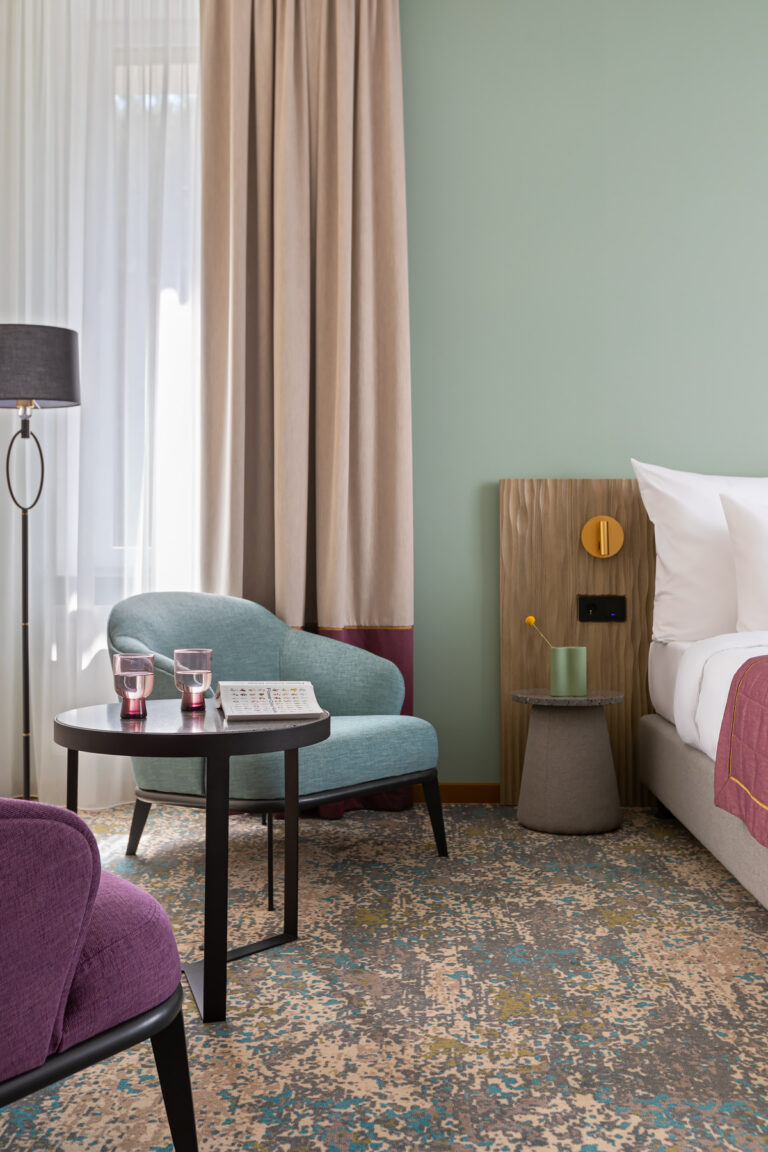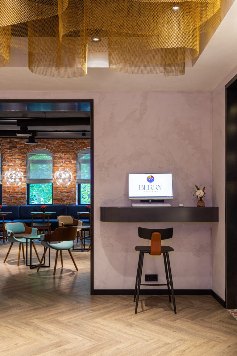 BERRY HOTEL & SPA 4* — не первый мой проект отеля, и я горжусь тем, что за свою карьеру мне удалось поработать с несколькими подобными пространствами. В этот раз мне предстояло создать масштабный дизайн-проект для отеля общей площадью около 4 000 кв. м — 6 этажей, 42 номера. Само название отеля — BERRY — диктует общий концепт, рождает различные ассоциации. Тем не менее мне хотелось уйти от очевидных ягодных образов в интерьере. Обыграть «природное» название удалось с помощью глубоких, насыщенных оттенков в интерьере; «ягодные» ассоциации поддерживает имитация лукошка — на ресепшене и в зоне барной стойки, а также стилизация потолка, напоминающего проступающий сквозь древесную листву свет, — в лобби.