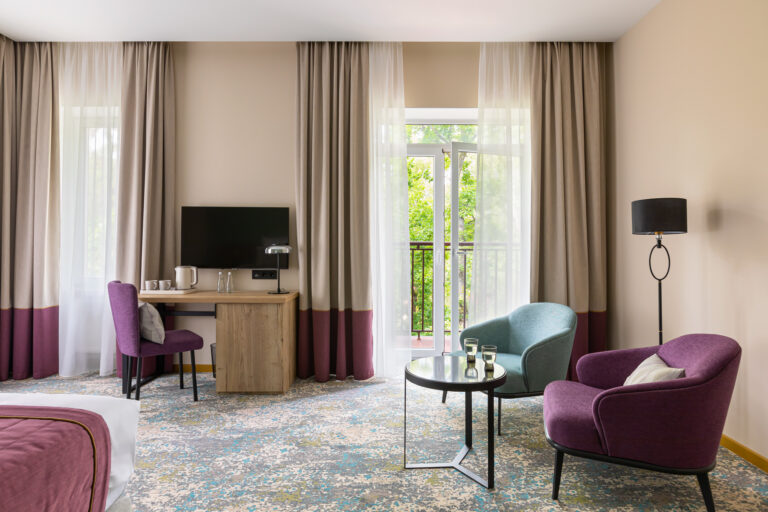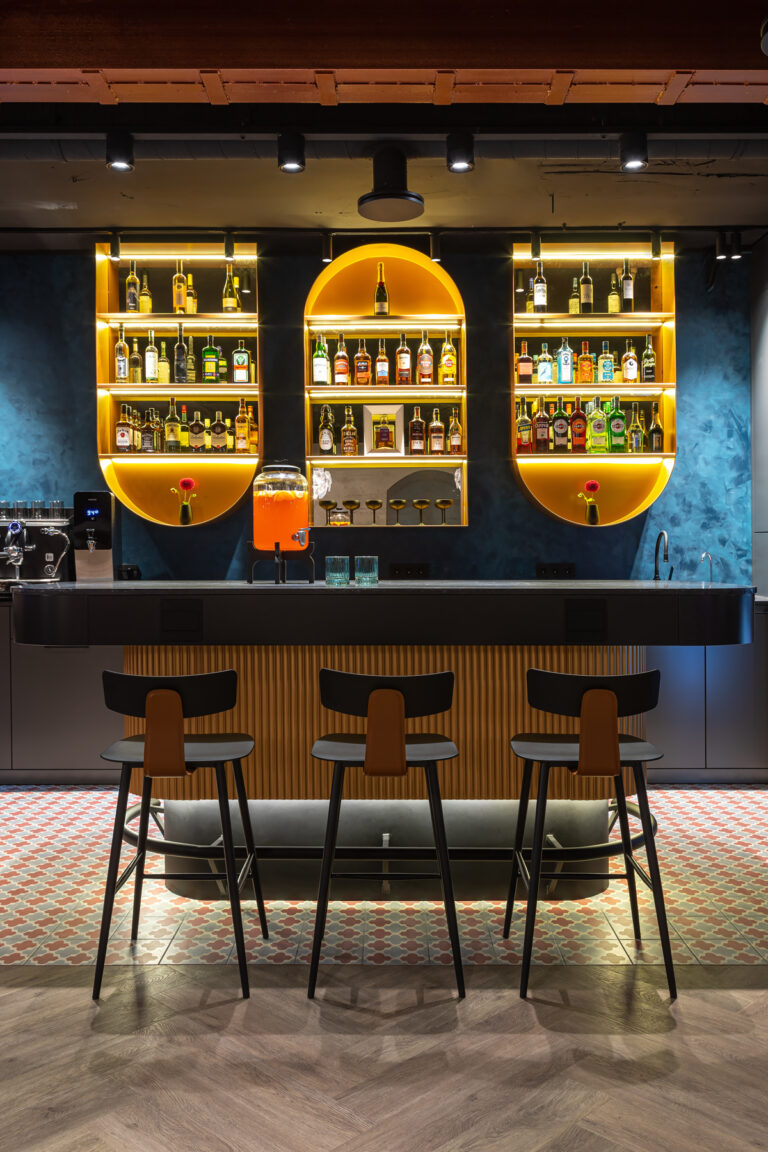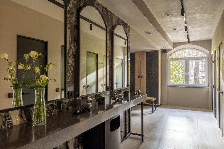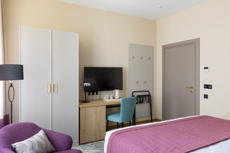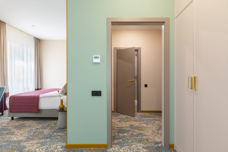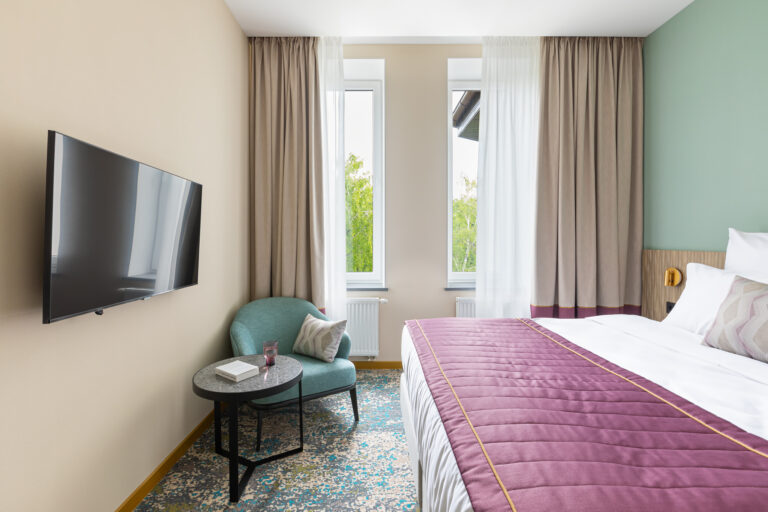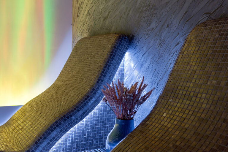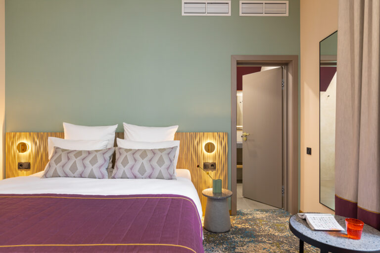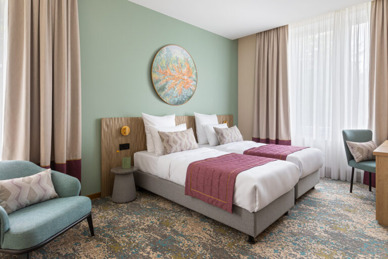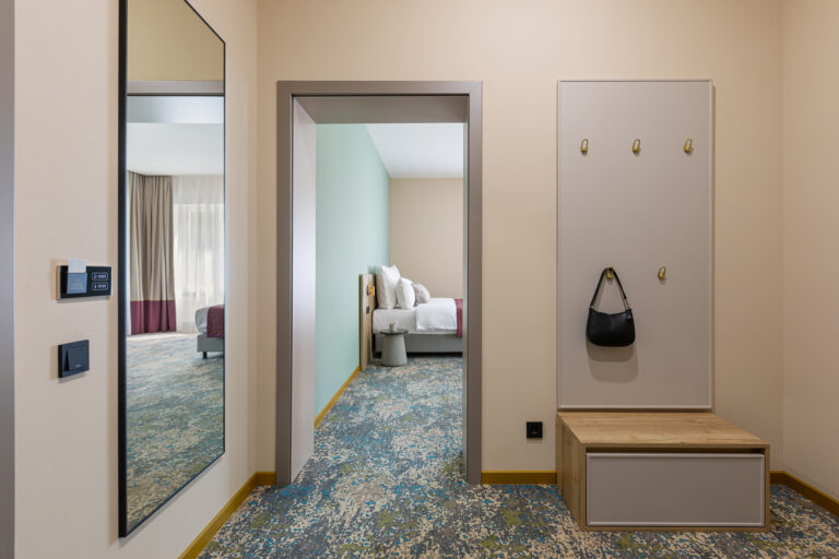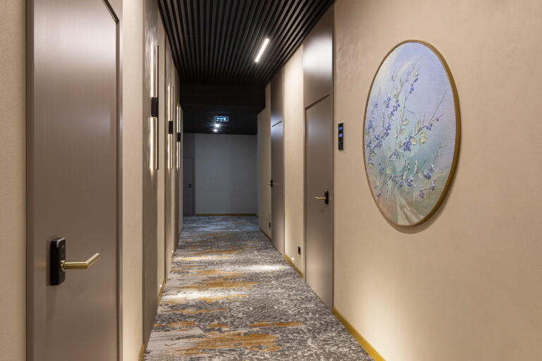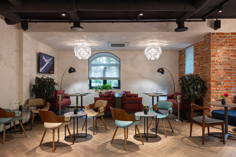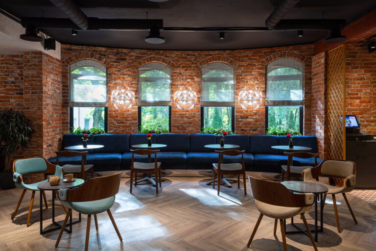 BERRY HOTEL & SPA 4* — не первый мой проект отеля, и я горжусь тем, что за свою карьеру мне удалось поработать с несколькими подобными пространствами. В этот раз мне предстояло создать масштабный дизайн-проект для отеля общей площадью около 4 000 кв. м — 6 этажей, 42 номера. Само название отеля — BERRY — диктует общий концепт, рождает различные ассоциации. Тем не менее мне хотелось уйти от очевидных ягодных образов в интерьере. Обыграть «природное» название удалось с помощью глубоких, насыщенных оттенков в интерьере; «ягодные» ассоциации поддерживает имитация лукошка — на ресепшене и в зоне барной стойки, а также стилизация потолка, напоминающего проступающий сквозь древесную листву свет, — в лобби.