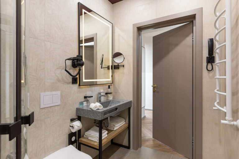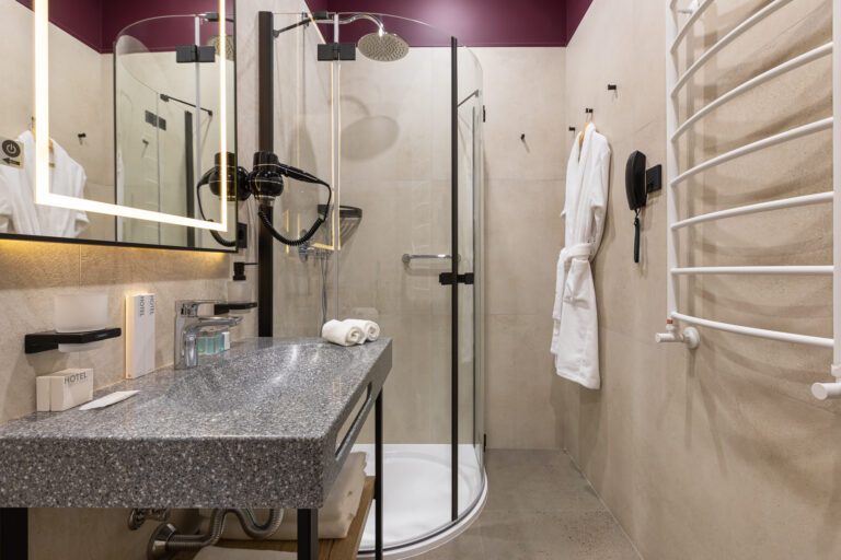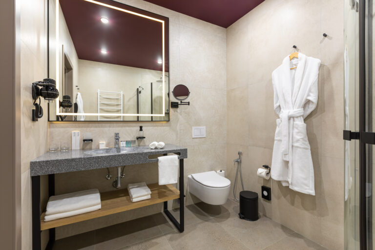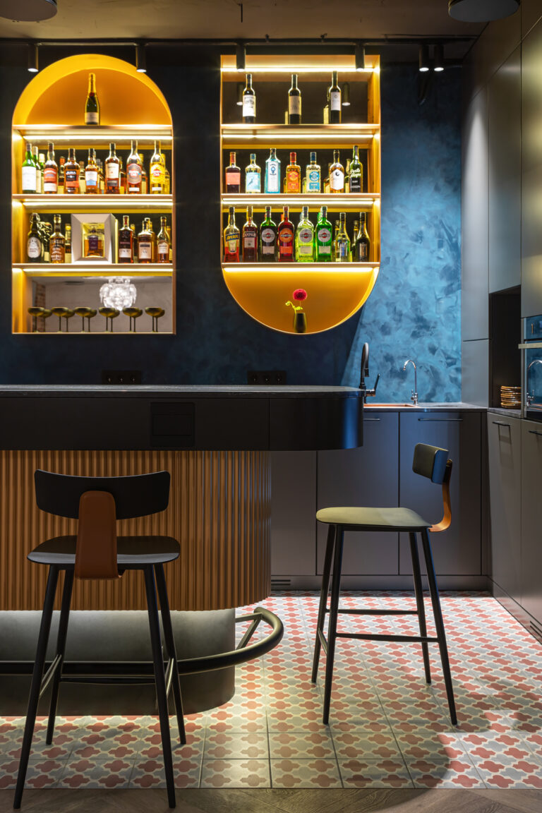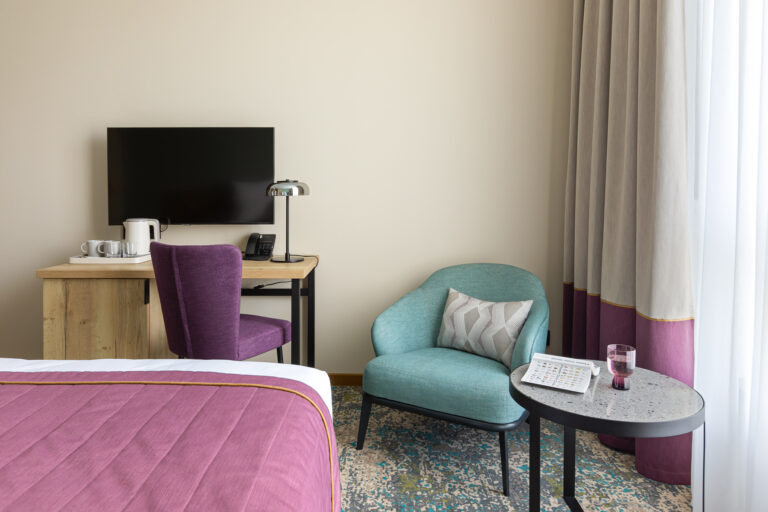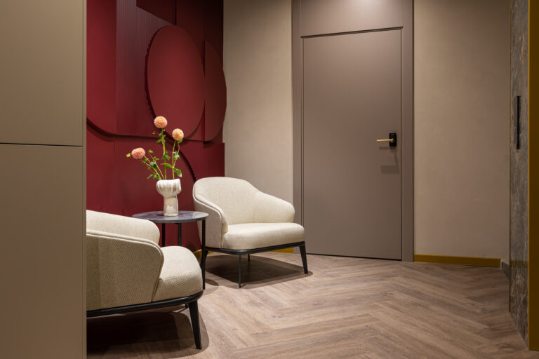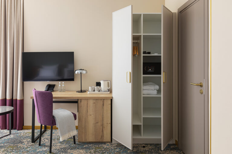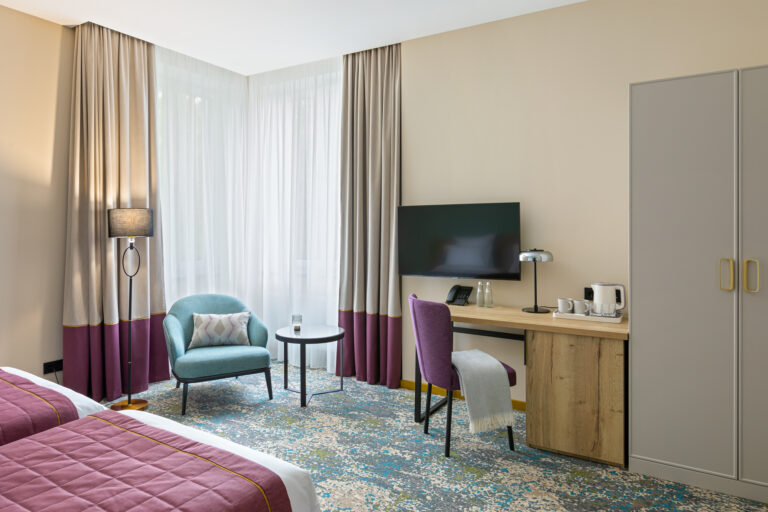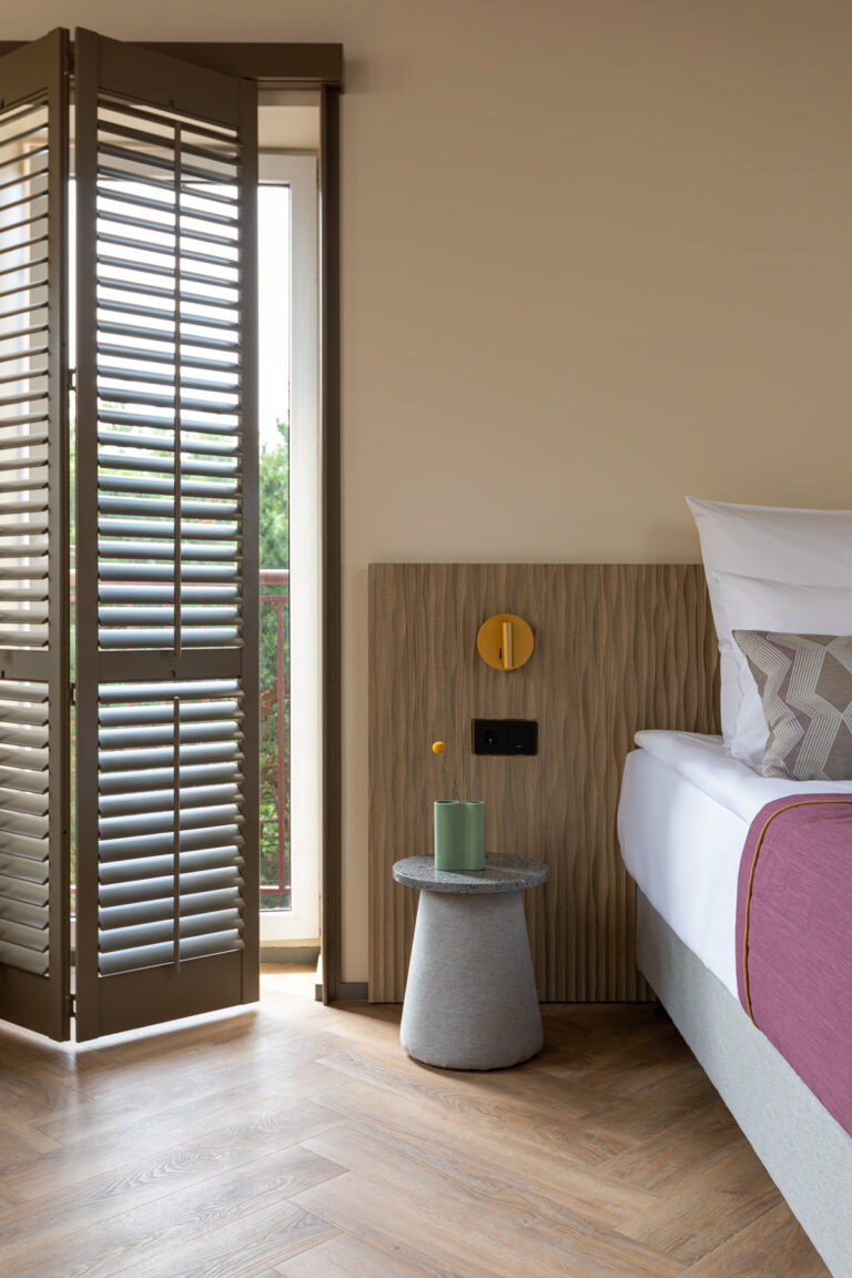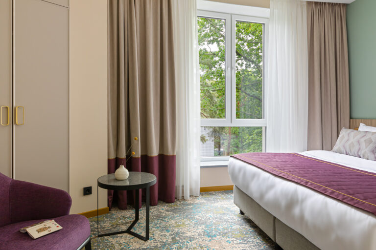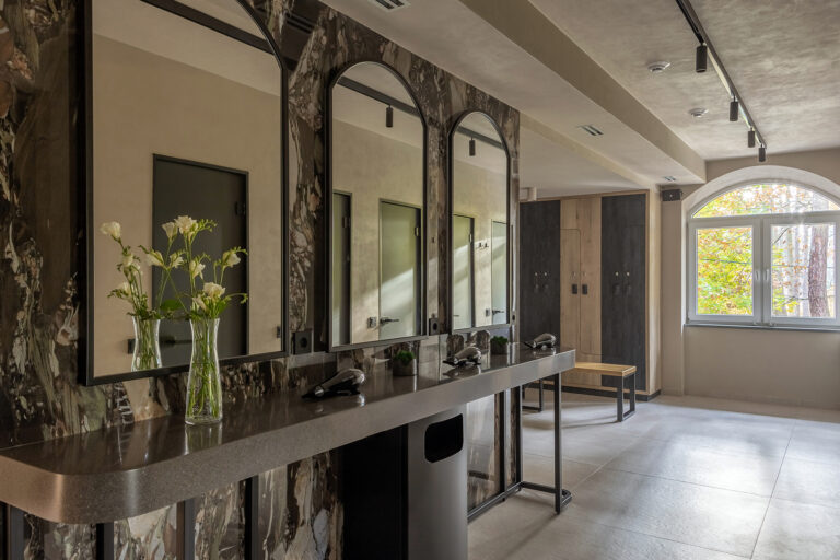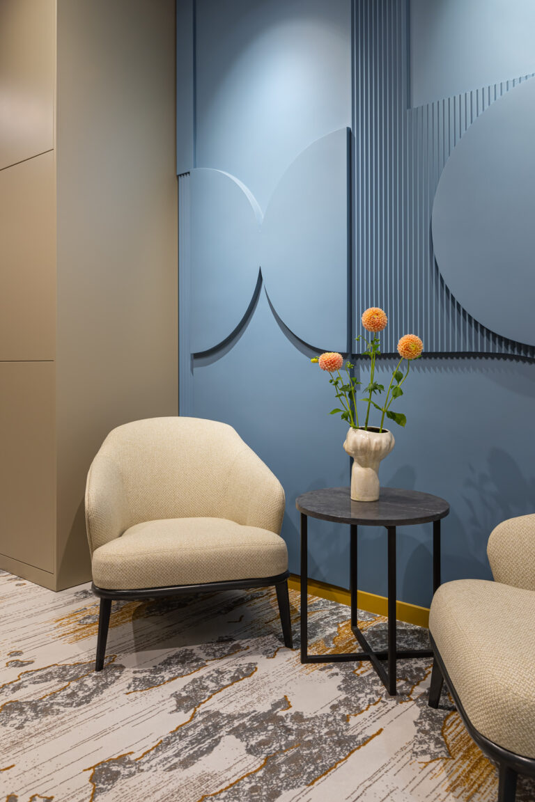 BERRY HOTEL & SPA 4* — не первый мой проект отеля, и я горжусь тем, что за свою карьеру мне удалось поработать с несколькими подобными пространствами. В этот раз мне предстояло создать масштабный дизайн-проект для отеля общей площадью около 4 000 кв. м — 6 этажей, 42 номера. Само название отеля — BERRY — диктует общий концепт, рождает различные ассоциации. Тем не менее мне хотелось уйти от очевидных ягодных образов в интерьере. Обыграть «природное» название удалось с помощью глубоких, насыщенных оттенков в интерьере; «ягодные» ассоциации поддерживает имитация лукошка — на ресепшене и в зоне барной стойки, а также стилизация потолка, напоминающего проступающий сквозь древесную листву свет, — в лобби.