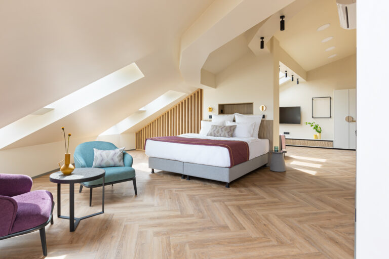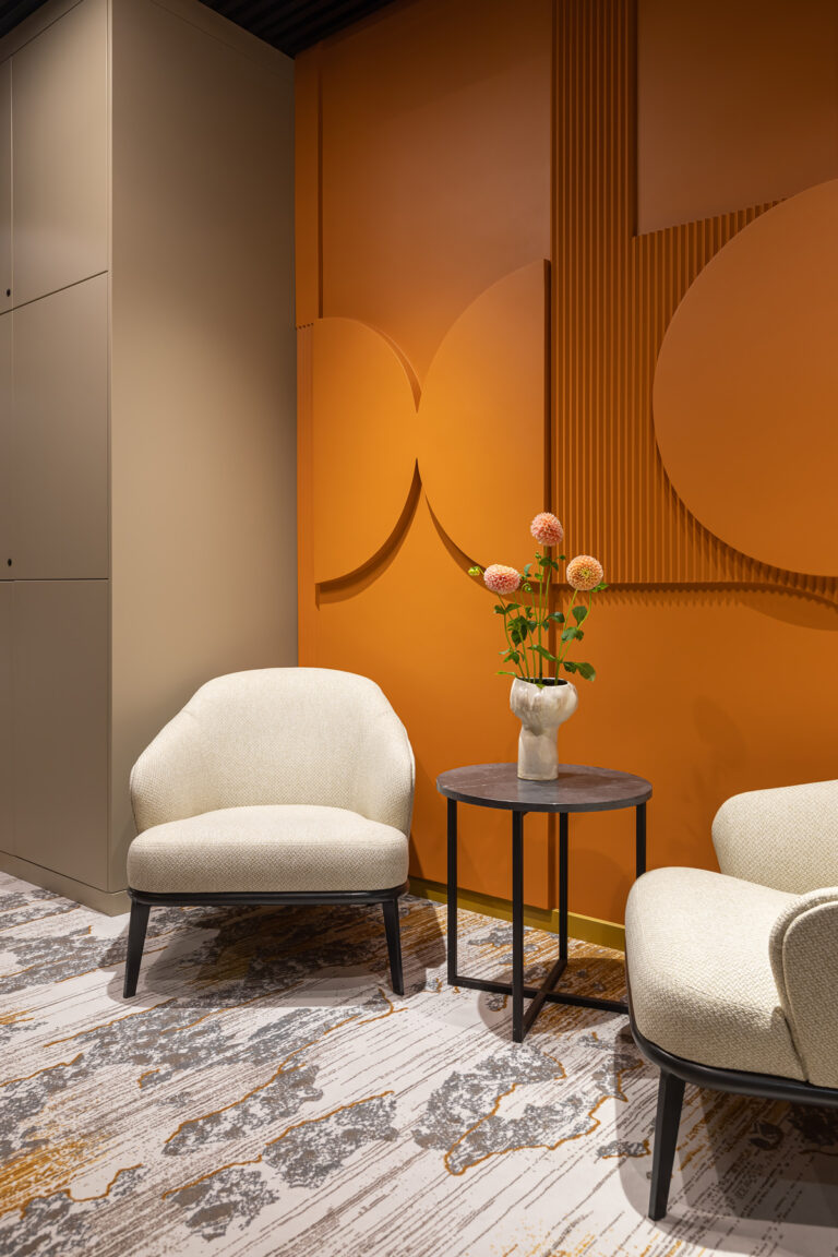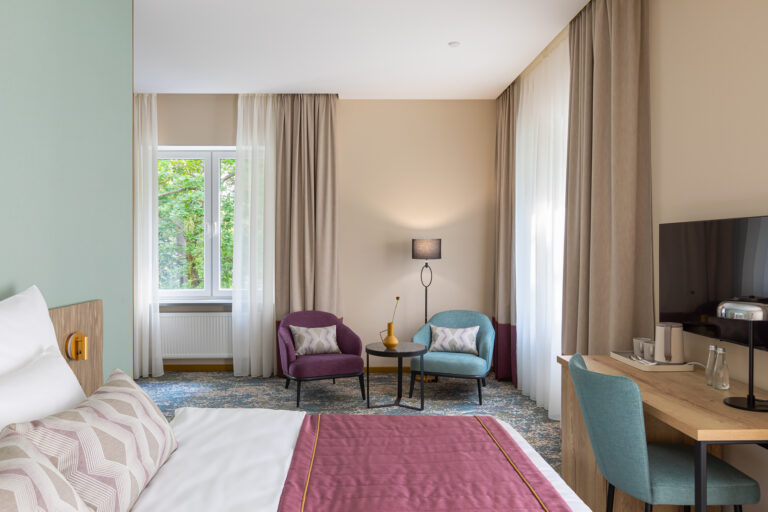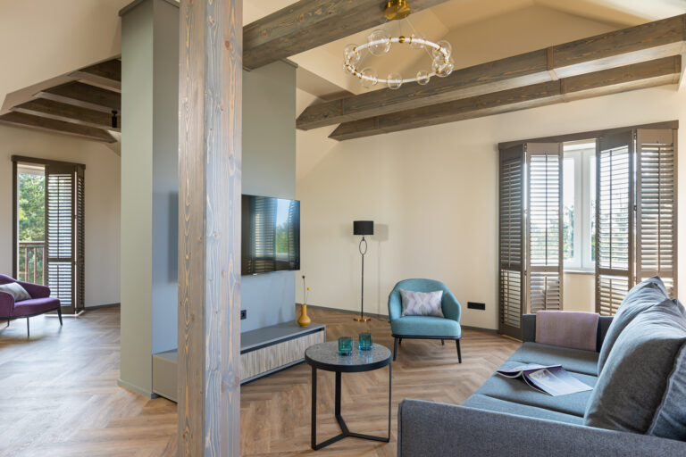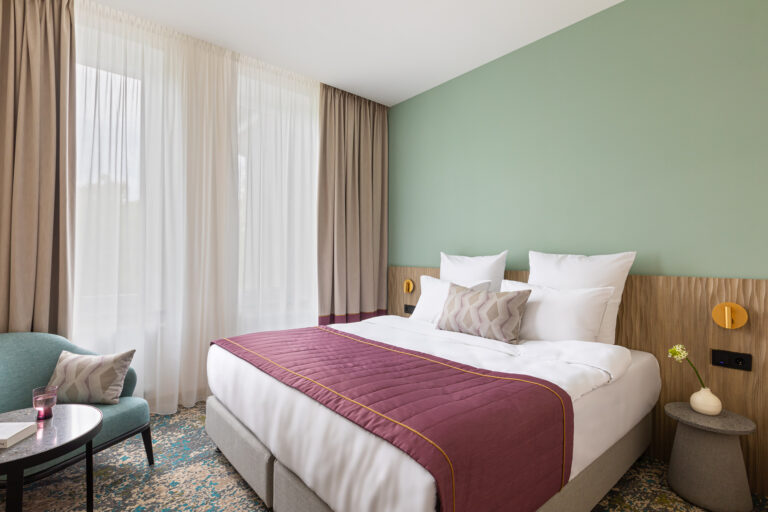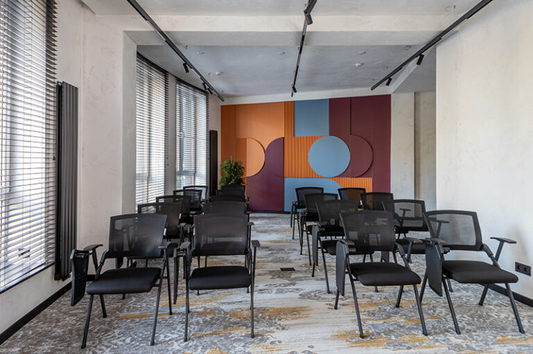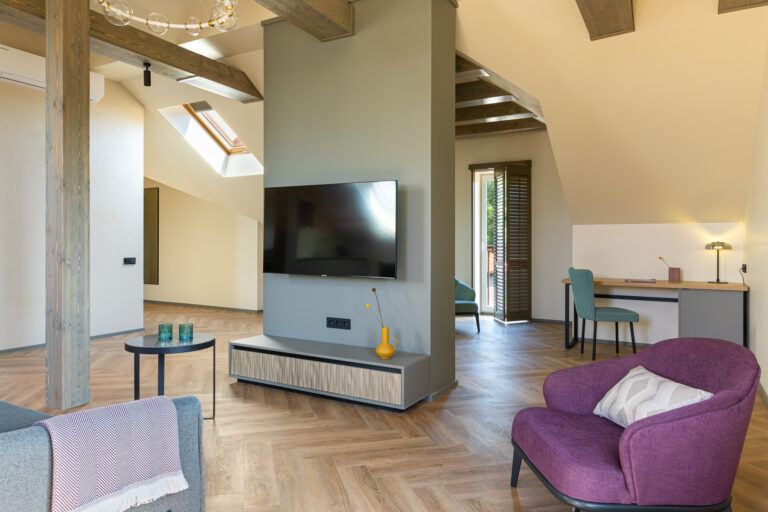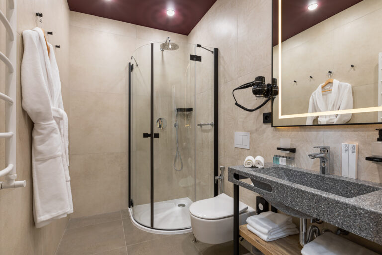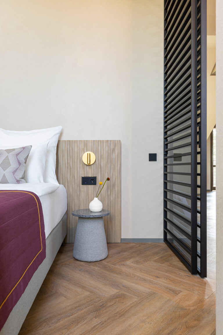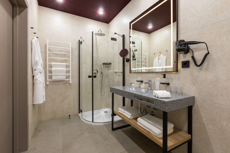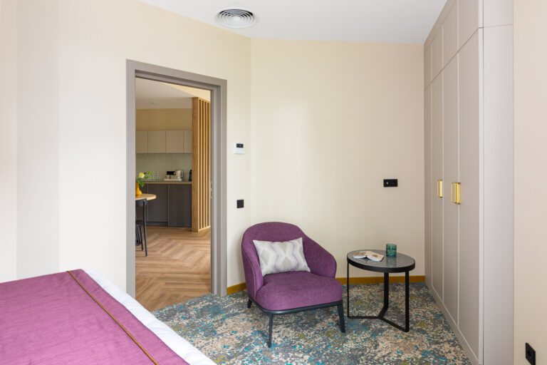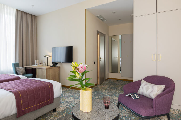 BERRY HOTEL & SPA 4* — не первый мой проект отеля, и я горжусь тем, что за свою карьеру мне удалось поработать с несколькими подобными пространствами. В этот раз мне предстояло создать масштабный дизайн-проект для отеля общей площадью около 4 000 кв. м — 6 этажей, 42 номера. Само название отеля — BERRY — диктует общий концепт, рождает различные ассоциации. Тем не менее мне хотелось уйти от очевидных ягодных образов в интерьере. Обыграть «природное» название удалось с помощью глубоких, насыщенных оттенков в интерьере; «ягодные» ассоциации поддерживает имитация лукошка — на ресепшене и в зоне барной стойки, а также стилизация потолка, напоминающего проступающий сквозь древесную листву свет, — в лобби.