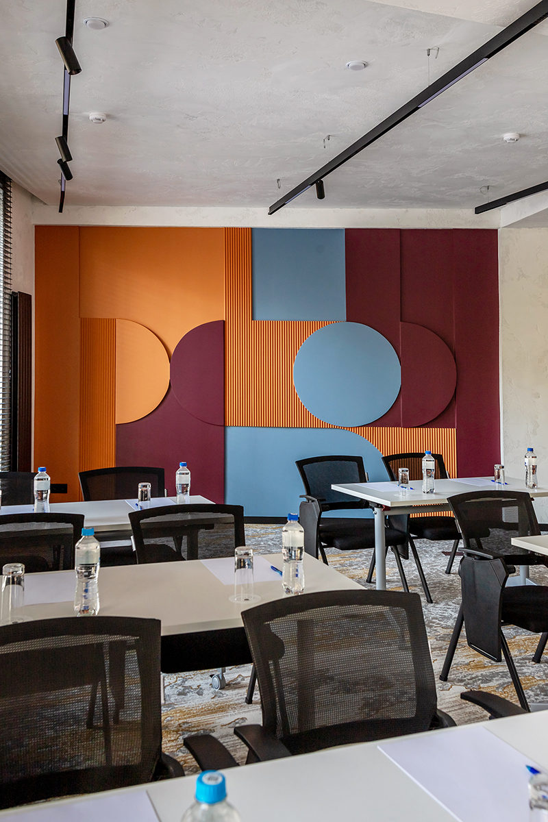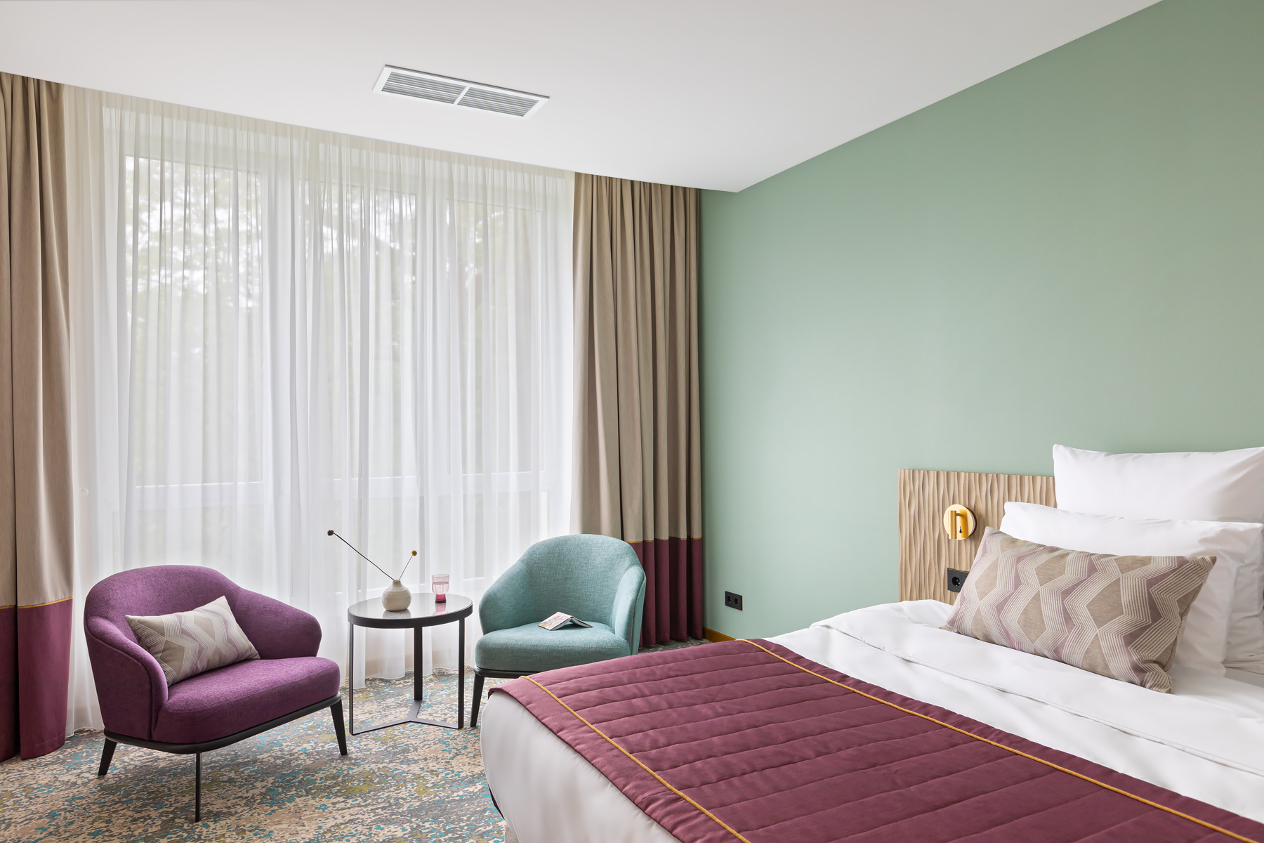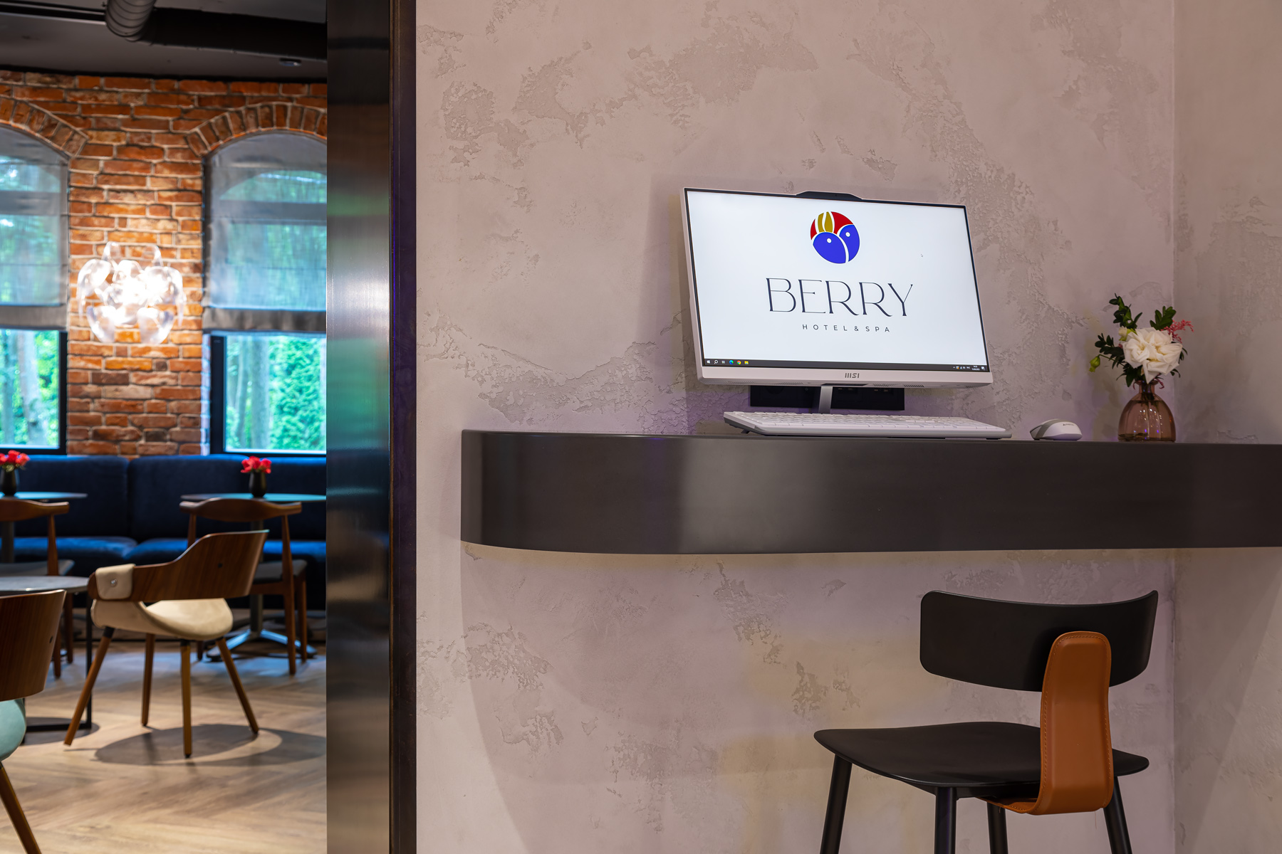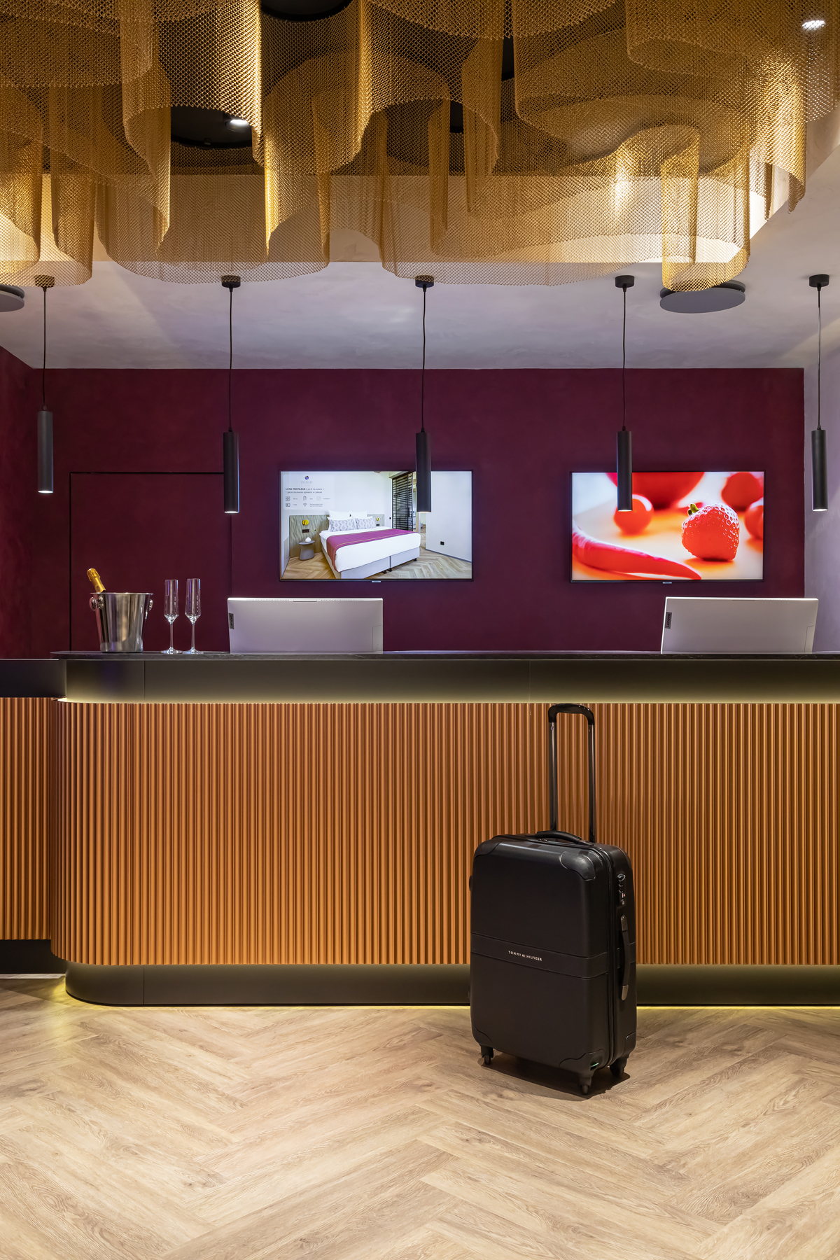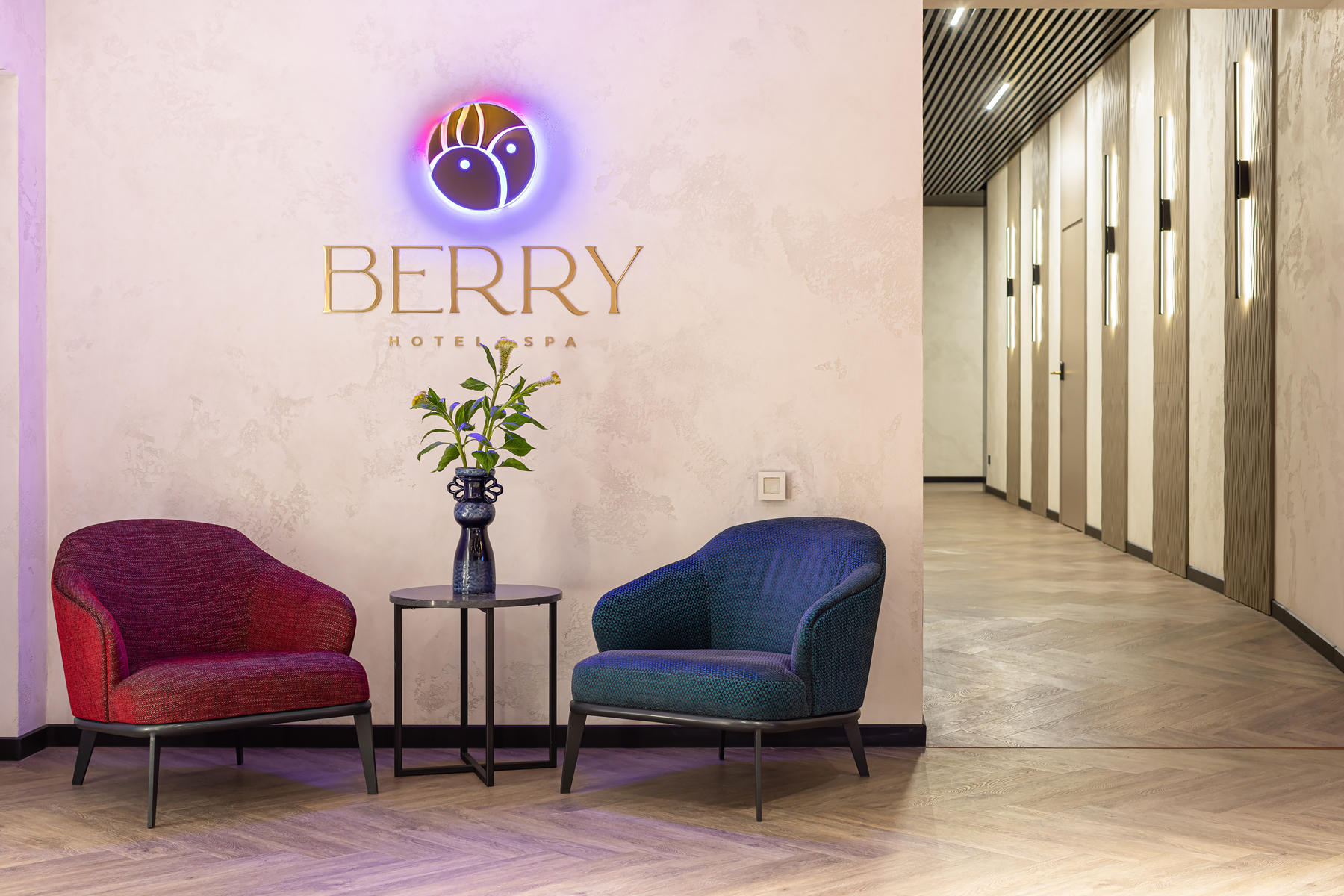 BERRY HOTEL & SPA 4* — не первый мой проект отеля, и я горжусь тем, что за свою карьеру мне удалось поработать с несколькими подобными пространствами. В этот раз мне предстояло создать масштабный дизайн-проект для отеля общей площадью около 4 000 кв. м — 6 этажей, 42 номера. Само название отеля — BERRY — диктует общий концепт, рождает различные ассоциации. Тем не менее мне хотелось уйти от очевидных ягодных образов в интерьере. Обыграть «природное» название удалось с помощью глубоких, насыщенных оттенков в интерьере; «ягодные» ассоциации поддерживает имитация лукошка — на ресепшене и в зоне барной стойки, а также стилизация потолка, напоминающего проступающий сквозь древесную листву свет, — в лобби.