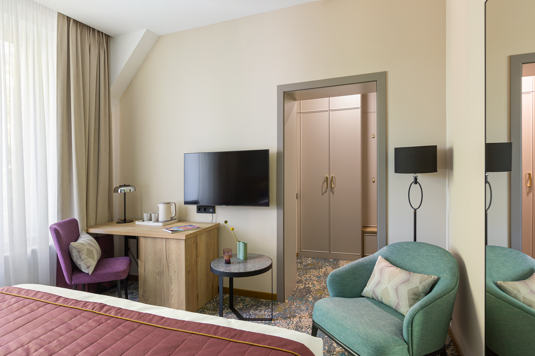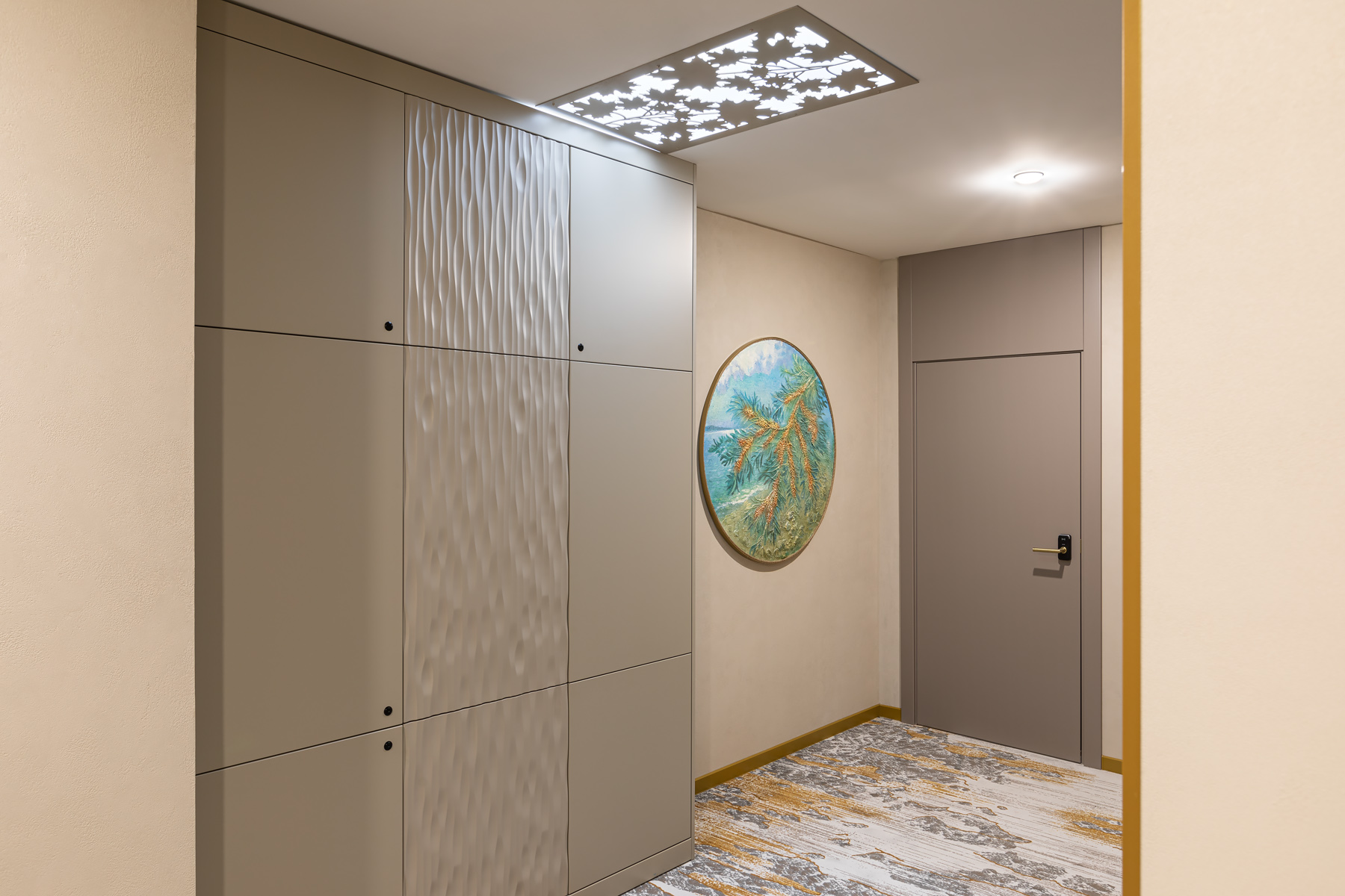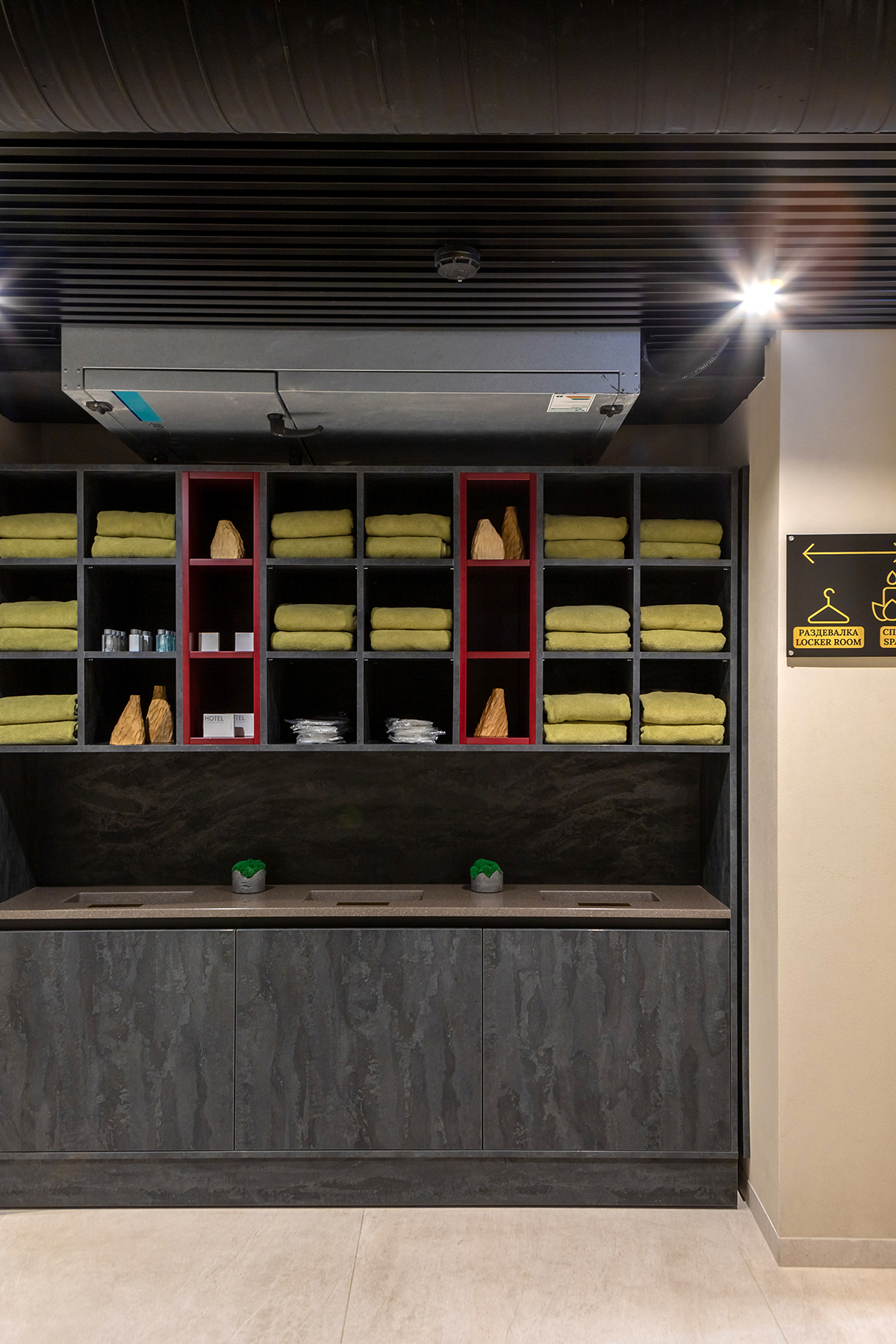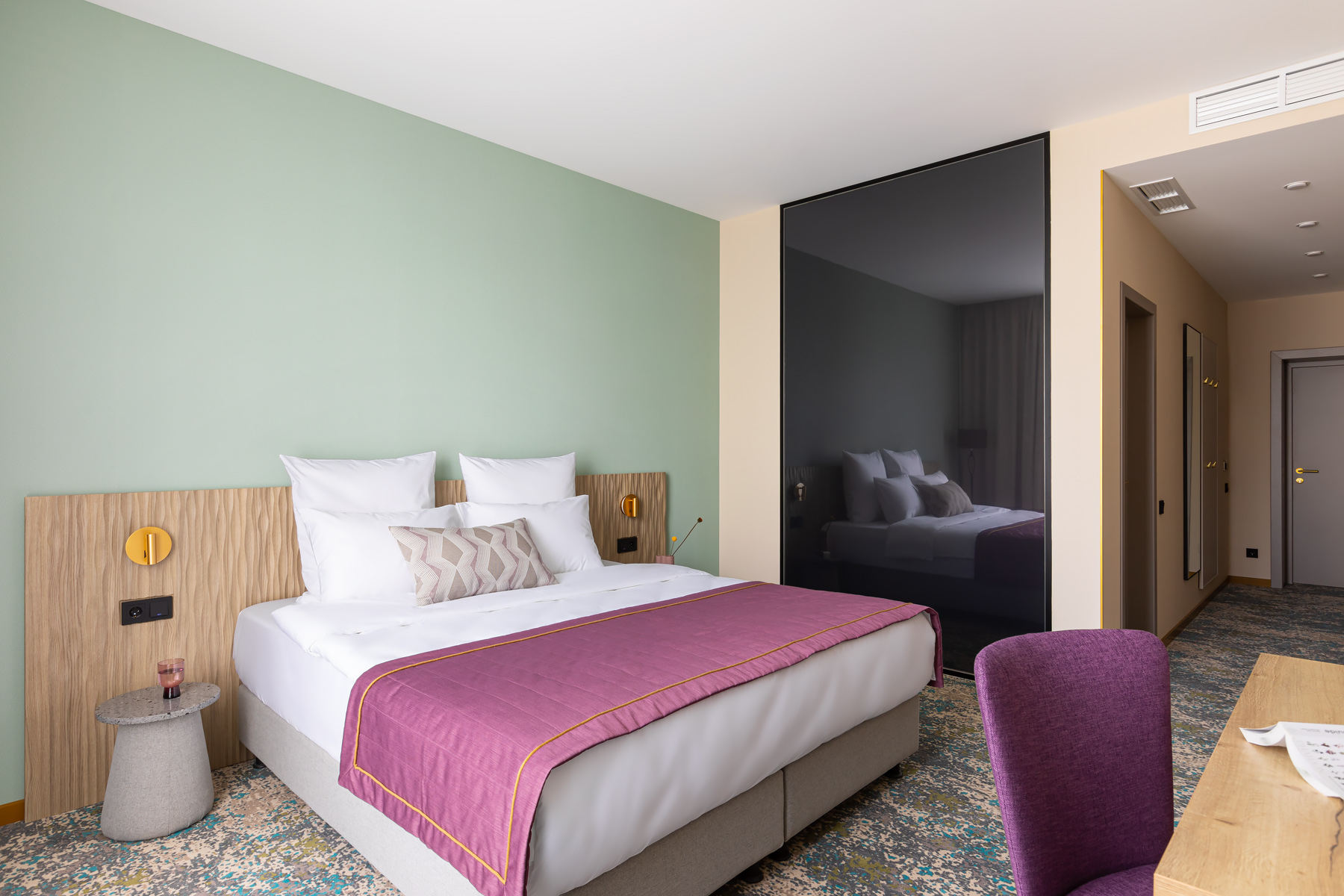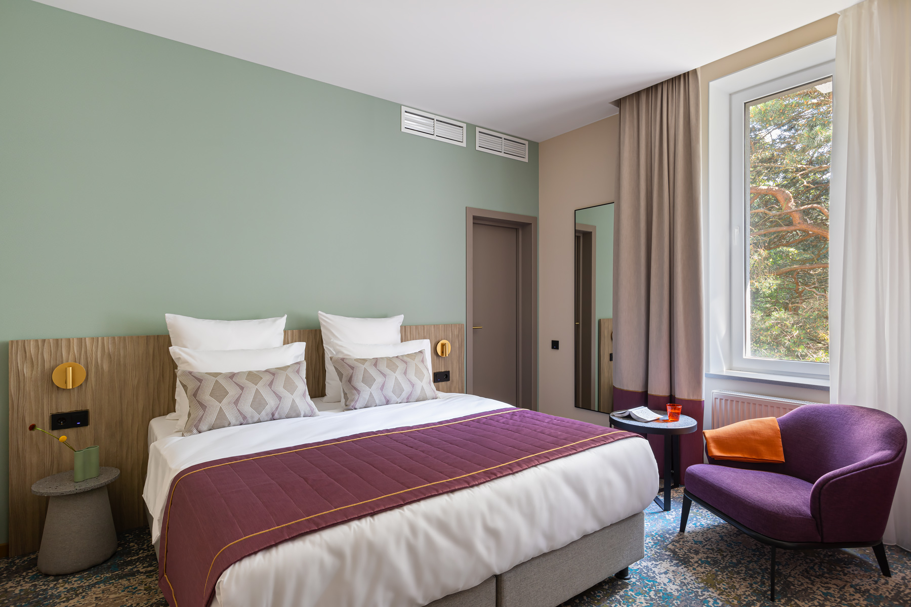 BERRY HOTEL & SPA 4* — не первый мой проект отеля, и я горжусь тем, что за свою карьеру мне удалось поработать с несколькими подобными пространствами. В этот раз мне предстояло создать масштабный дизайн-проект для отеля общей площадью около 4 000 кв. м — 6 этажей, 42 номера. Само название отеля — BERRY — диктует общий концепт, рождает различные ассоциации. Тем не менее мне хотелось уйти от очевидных ягодных образов в интерьере. Обыграть «природное» название удалось с помощью глубоких, насыщенных оттенков в интерьере; «ягодные» ассоциации поддерживает имитация лукошка — на ресепшене и в зоне барной стойки, а также стилизация потолка, напоминающего проступающий сквозь древесную листву свет, — в лобби.