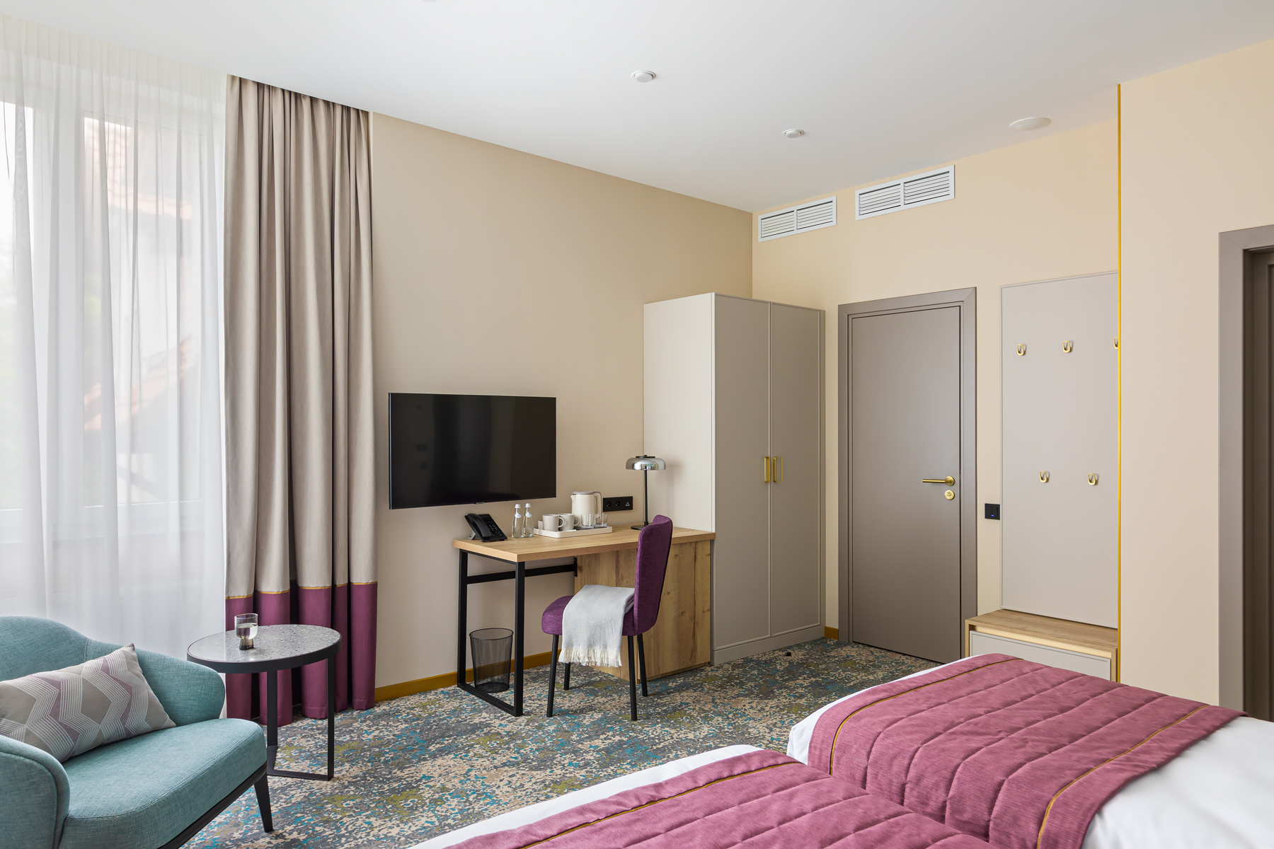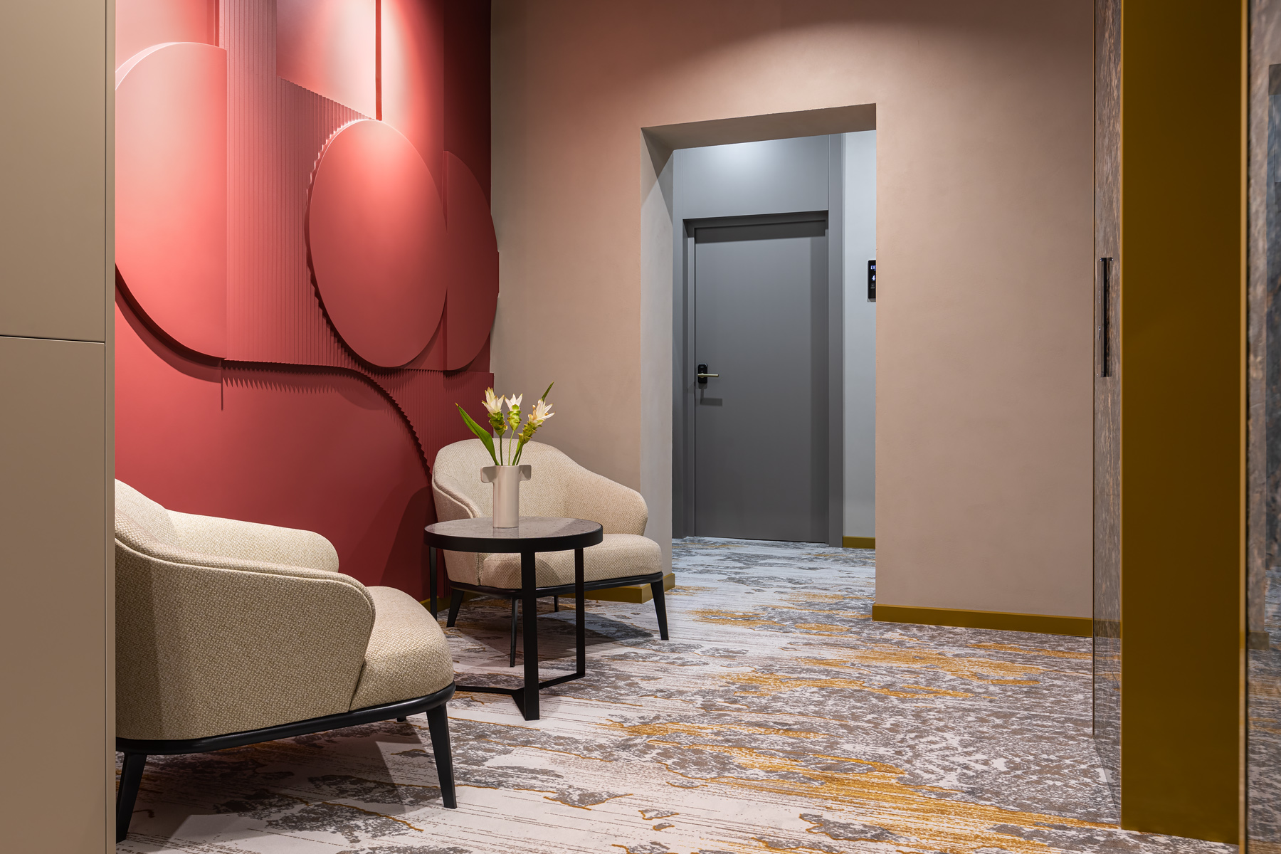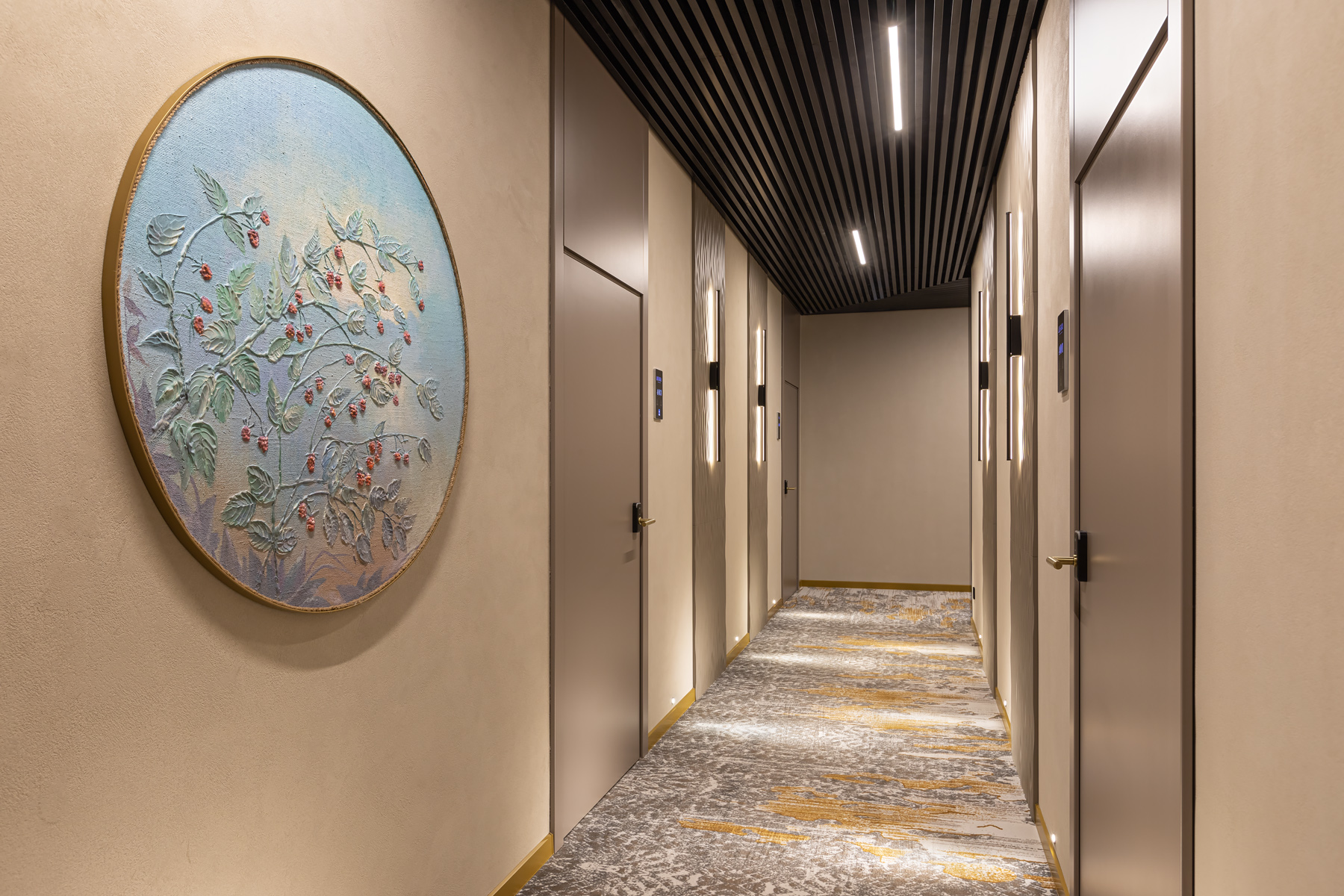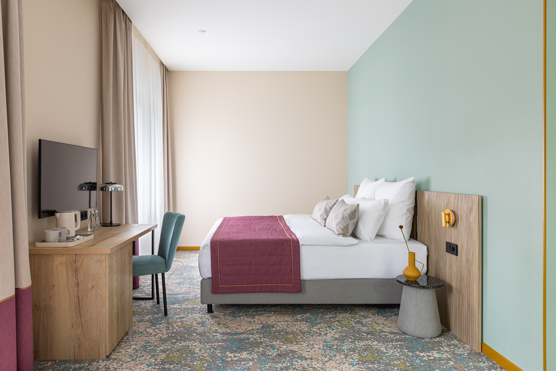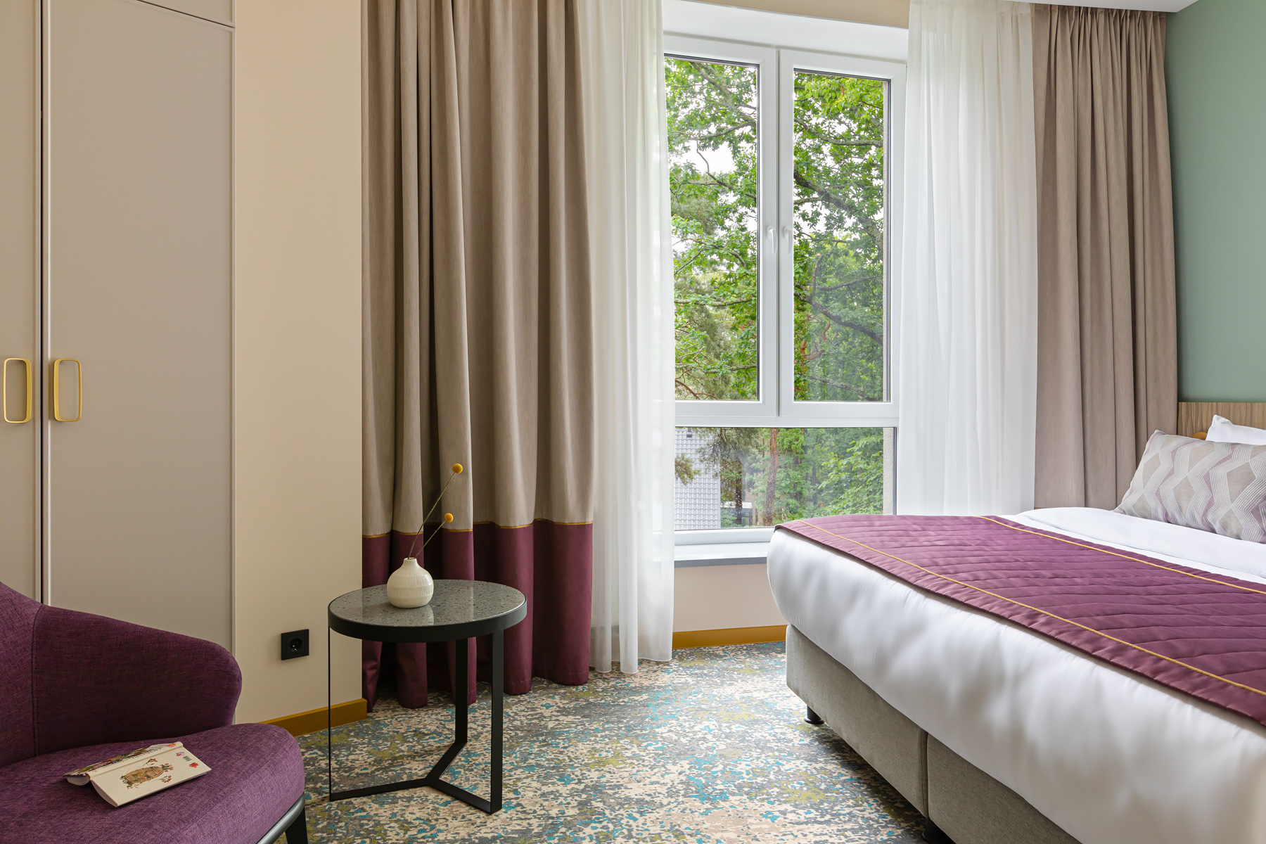 BERRY HOTEL & SPA 4* — не первый мой проект отеля, и я горжусь тем, что за свою карьеру мне удалось поработать с несколькими подобными пространствами. В этот раз мне предстояло создать масштабный дизайн-проект для отеля общей площадью около 4 000 кв. м — 6 этажей, 42 номера. Само название отеля — BERRY — диктует общий концепт, рождает различные ассоциации. Тем не менее мне хотелось уйти от очевидных ягодных образов в интерьере. Обыграть «природное» название удалось с помощью глубоких, насыщенных оттенков в интерьере; «ягодные» ассоциации поддерживает имитация лукошка — на ресепшене и в зоне барной стойки, а также стилизация потолка, напоминающего проступающий сквозь древесную листву свет, — в лобби.
