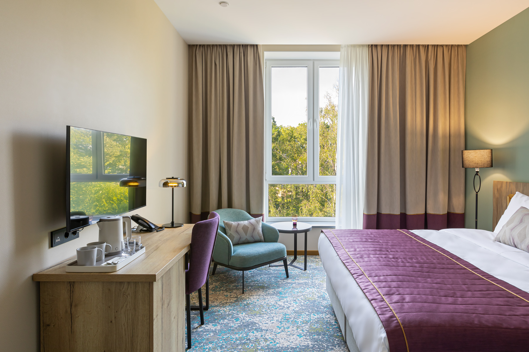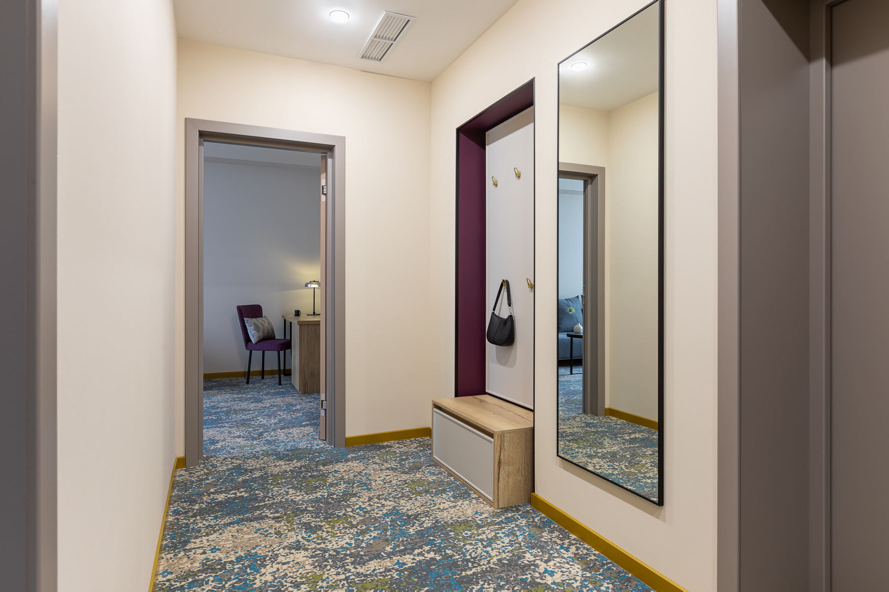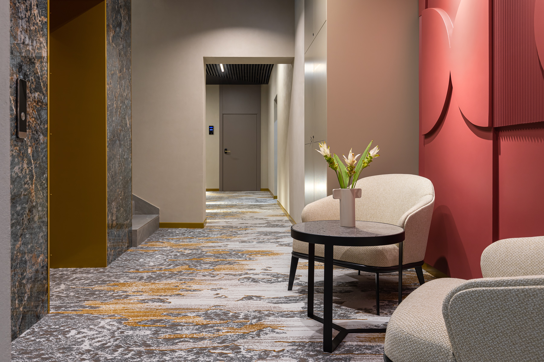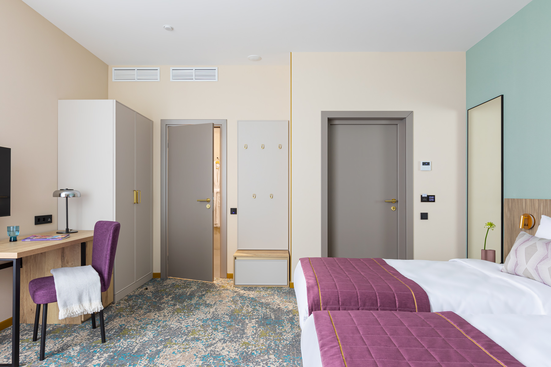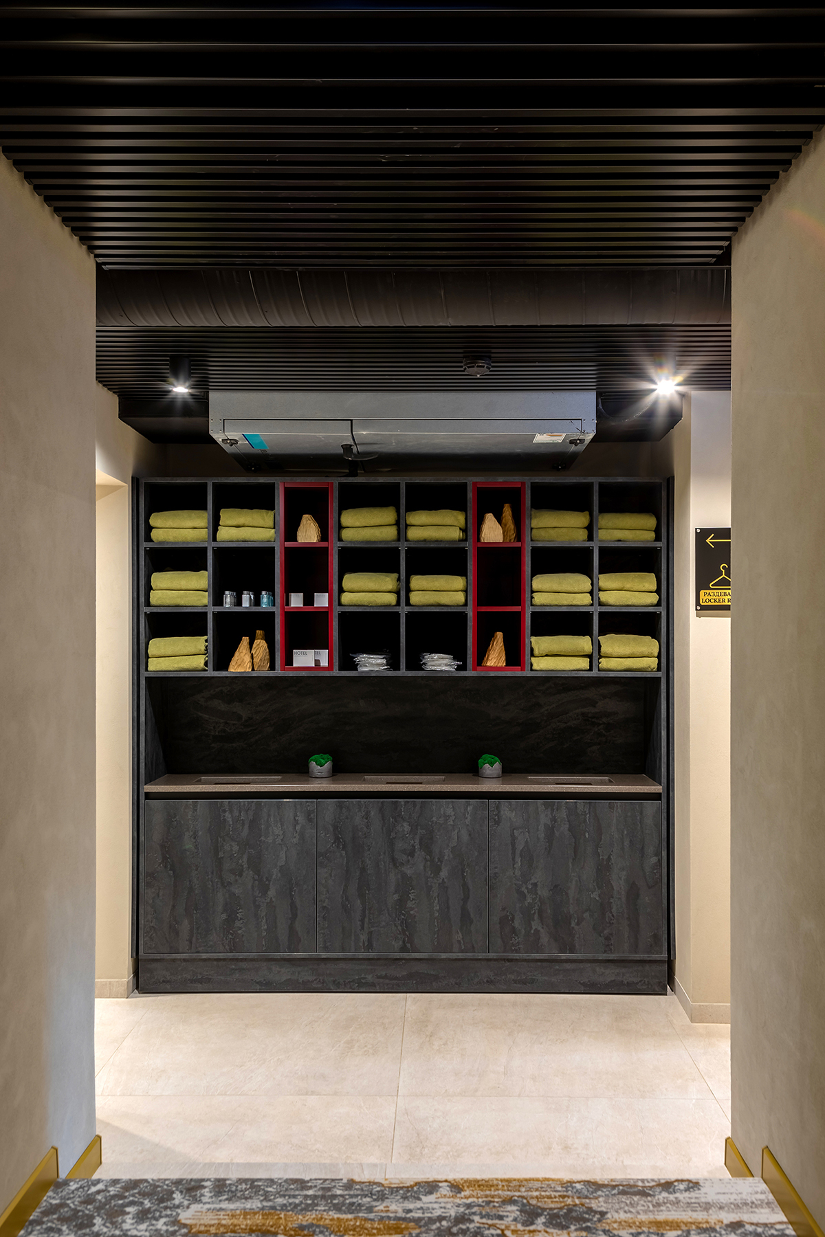 BERRY HOTEL & SPA 4* — не первый мой проект отеля, и я горжусь тем, что за свою карьеру мне удалось поработать с несколькими подобными пространствами. В этот раз мне предстояло создать масштабный дизайн-проект для отеля общей площадью около 4 000 кв. м — 6 этажей, 42 номера. Само название отеля — BERRY — диктует общий концепт, рождает различные ассоциации. Тем не менее мне хотелось уйти от очевидных ягодных образов в интерьере. Обыграть «природное» название удалось с помощью глубоких, насыщенных оттенков в интерьере; «ягодные» ассоциации поддерживает имитация лукошка — на ресепшене и в зоне барной стойки, а также стилизация потолка, напоминающего проступающий сквозь древесную листву свет, — в лобби.