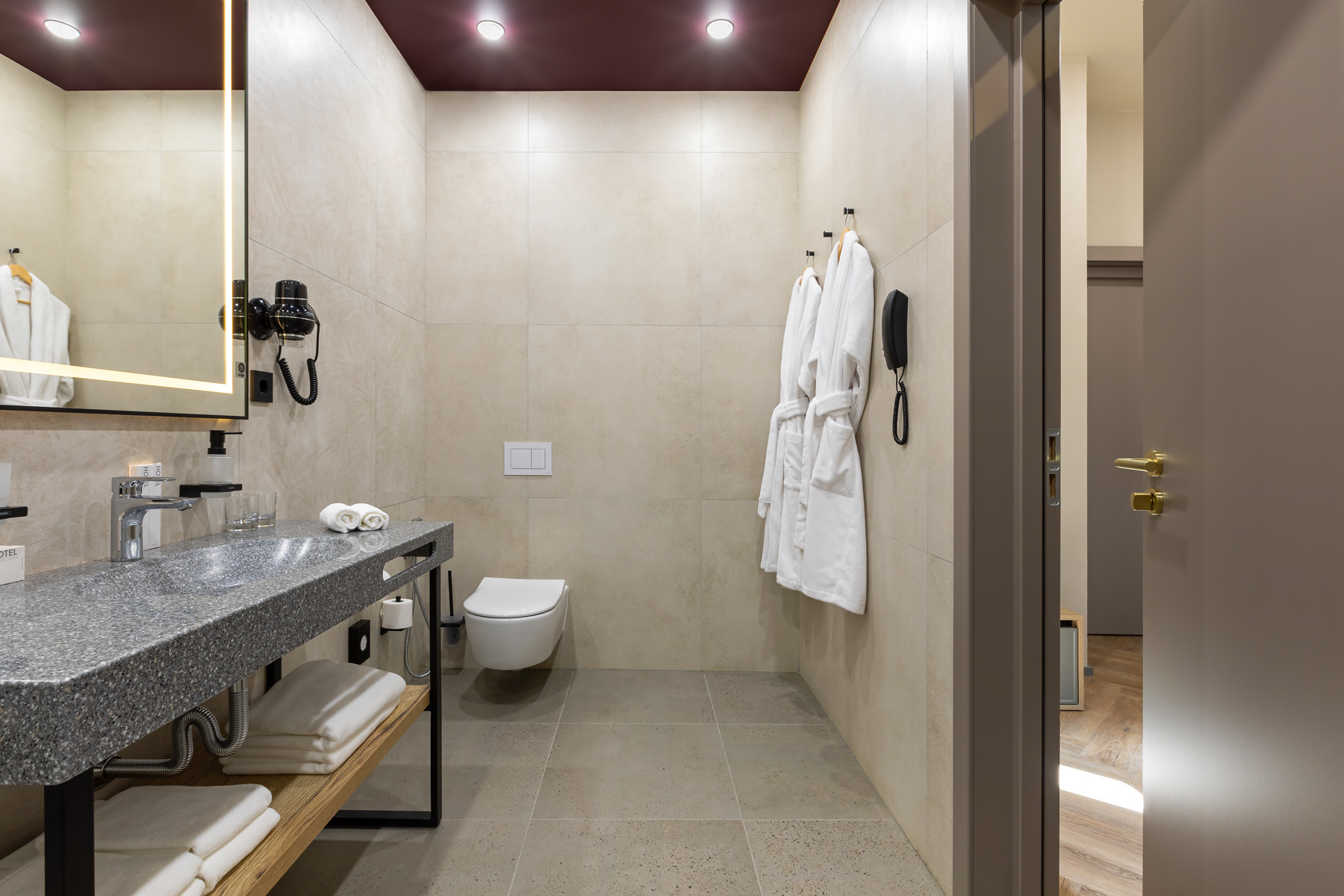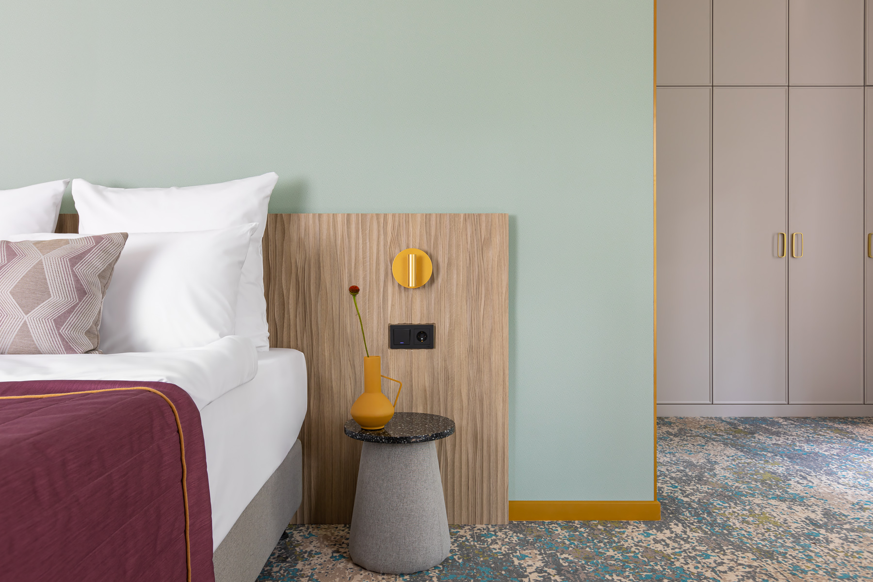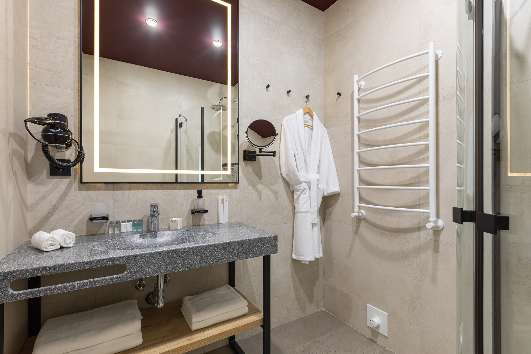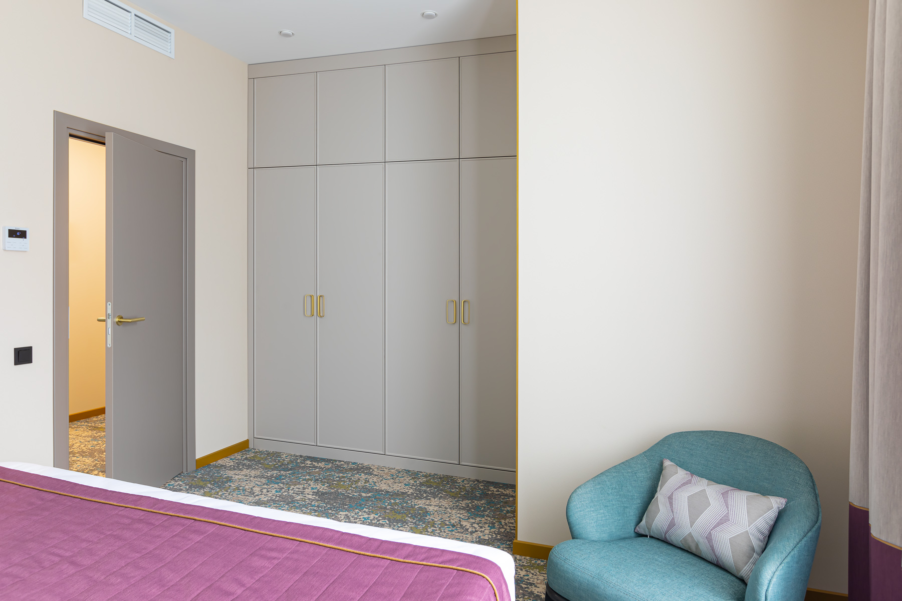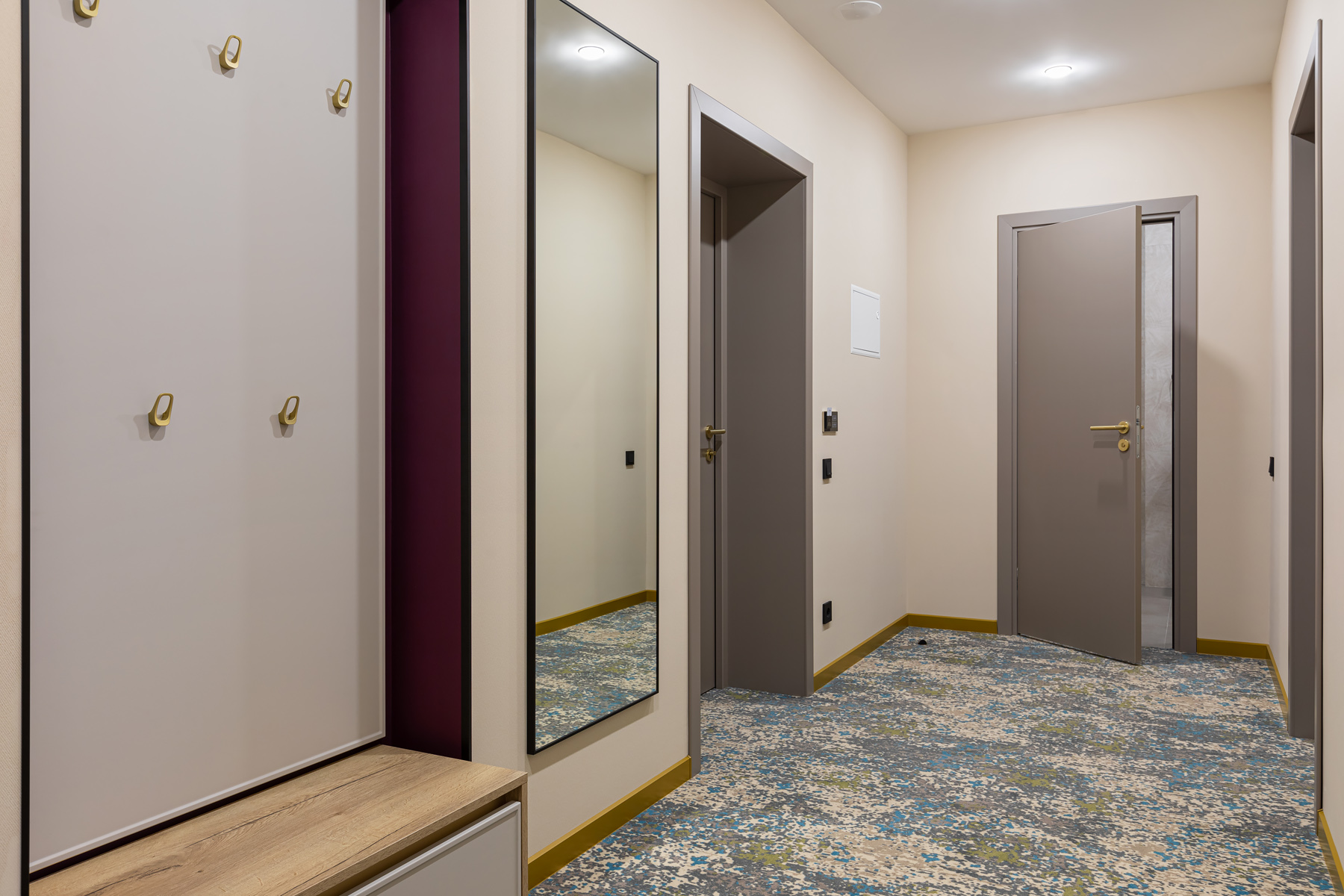 BERRY HOTEL & SPA 4* — не первый мой проект отеля, и я горжусь тем, что за свою карьеру мне удалось поработать с несколькими подобными пространствами. В этот раз мне предстояло создать масштабный дизайн-проект для отеля общей площадью около 4 000 кв. м — 6 этажей, 42 номера. Само название отеля — BERRY — диктует общий концепт, рождает различные ассоциации. Тем не менее мне хотелось уйти от очевидных ягодных образов в интерьере. Обыграть «природное» название удалось с помощью глубоких, насыщенных оттенков в интерьере; «ягодные» ассоциации поддерживает имитация лукошка — на ресепшене и в зоне барной стойки, а также стилизация потолка, напоминающего проступающий сквозь древесную листву свет, — в лобби.