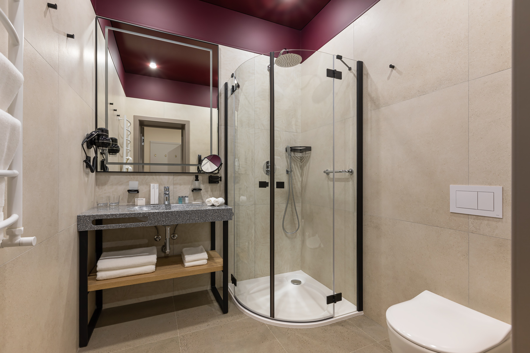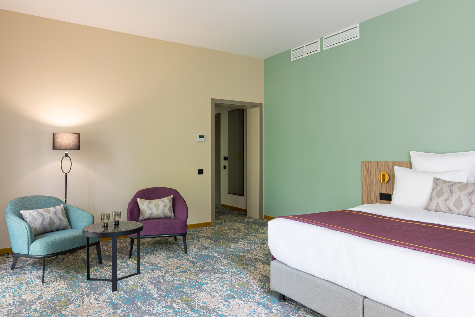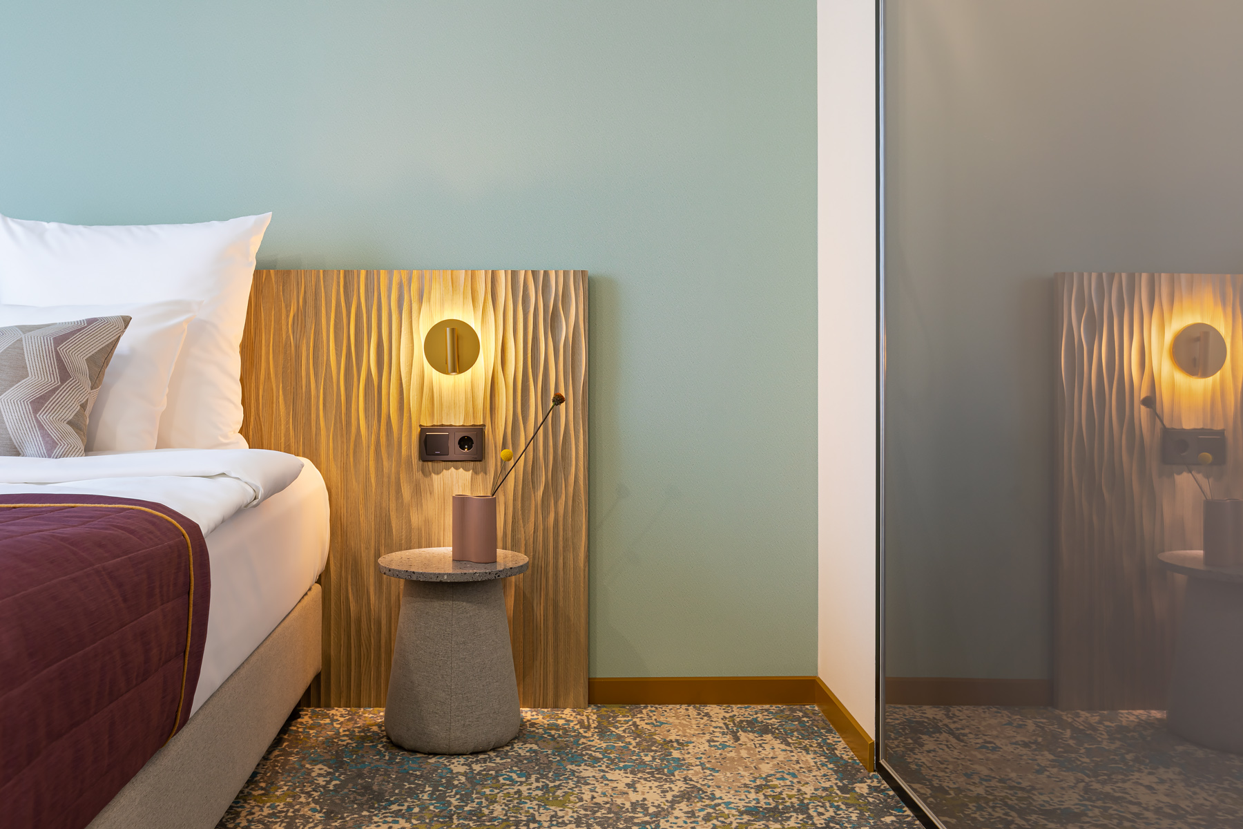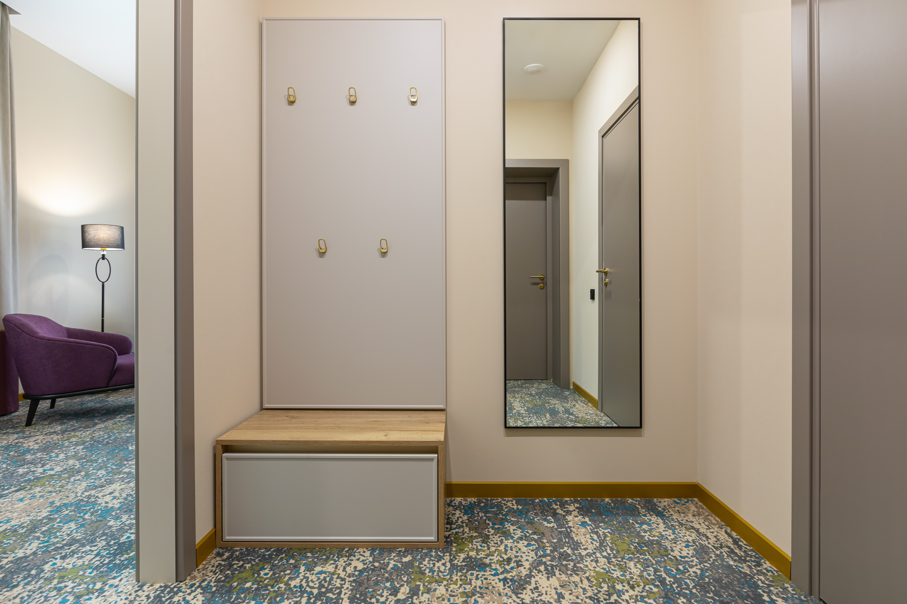 BERRY HOTEL & SPA 4* — не первый мой проект отеля, и я горжусь тем, что за свою карьеру мне удалось поработать с несколькими подобными пространствами. В этот раз мне предстояло создать масштабный дизайн-проект для отеля общей площадью около 4 000 кв. м — 6 этажей, 42 номера. Само название отеля — BERRY — диктует общий концепт, рождает различные ассоциации. Тем не менее мне хотелось уйти от очевидных ягодных образов в интерьере. Обыграть «природное» название удалось с помощью глубоких, насыщенных оттенков в интерьере; «ягодные» ассоциации поддерживает имитация лукошка — на ресепшене и в зоне барной стойки, а также стилизация потолка, напоминающего проступающий сквозь древесную листву свет, — в лобби.