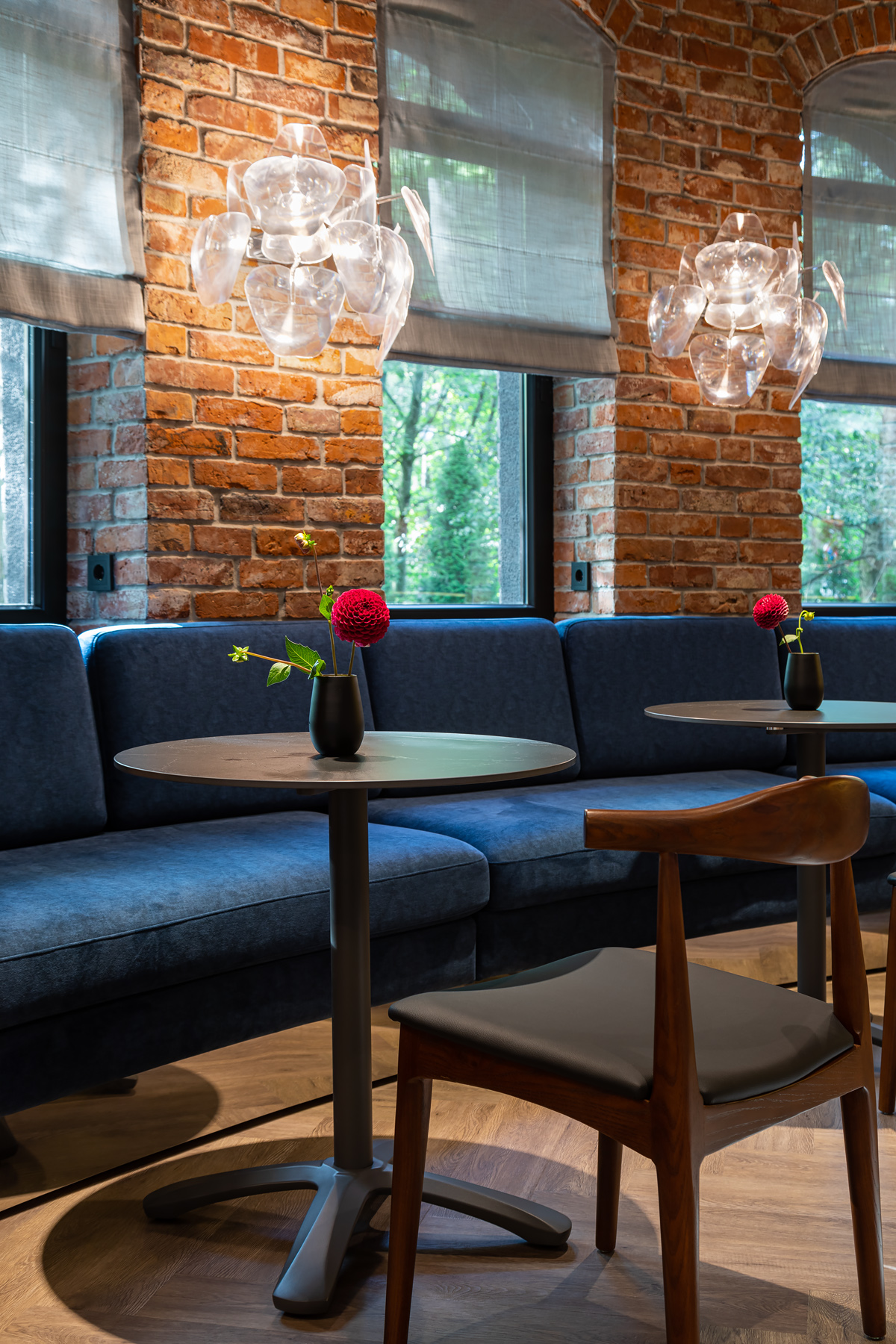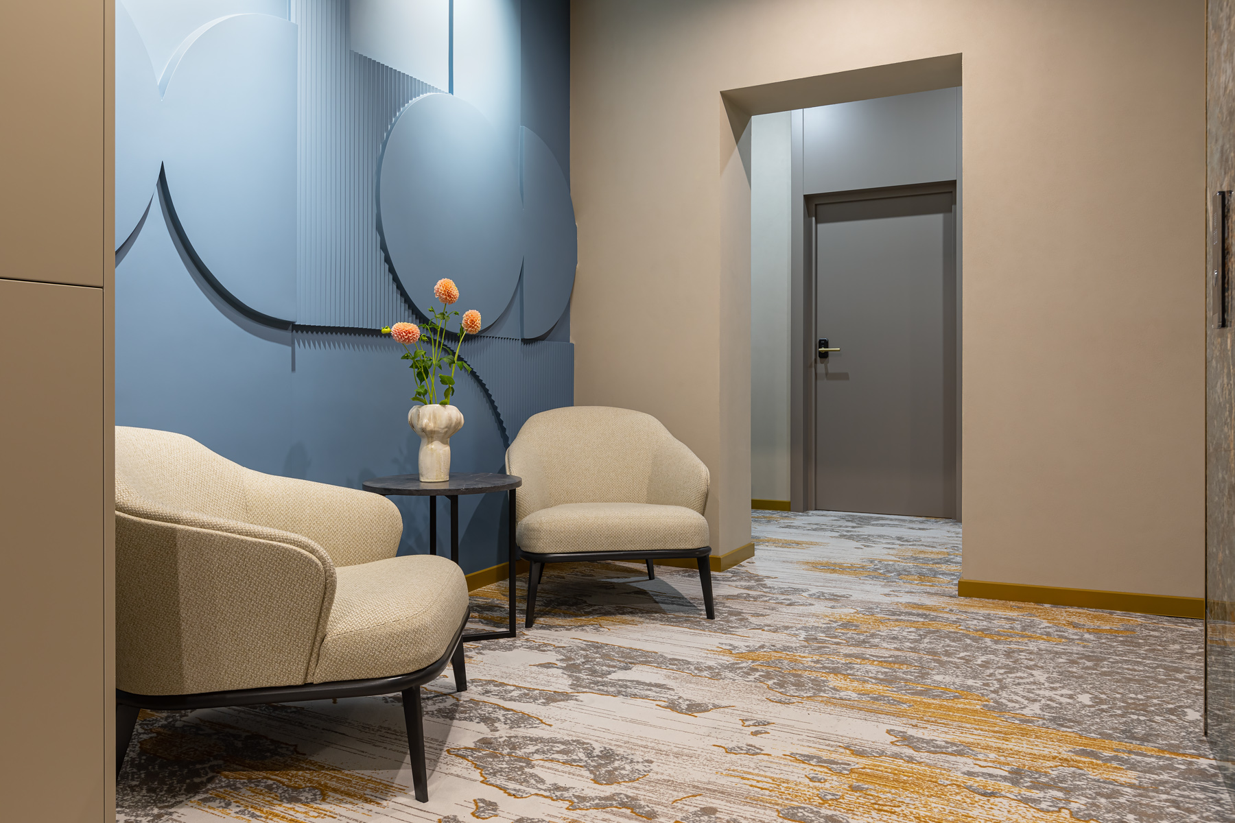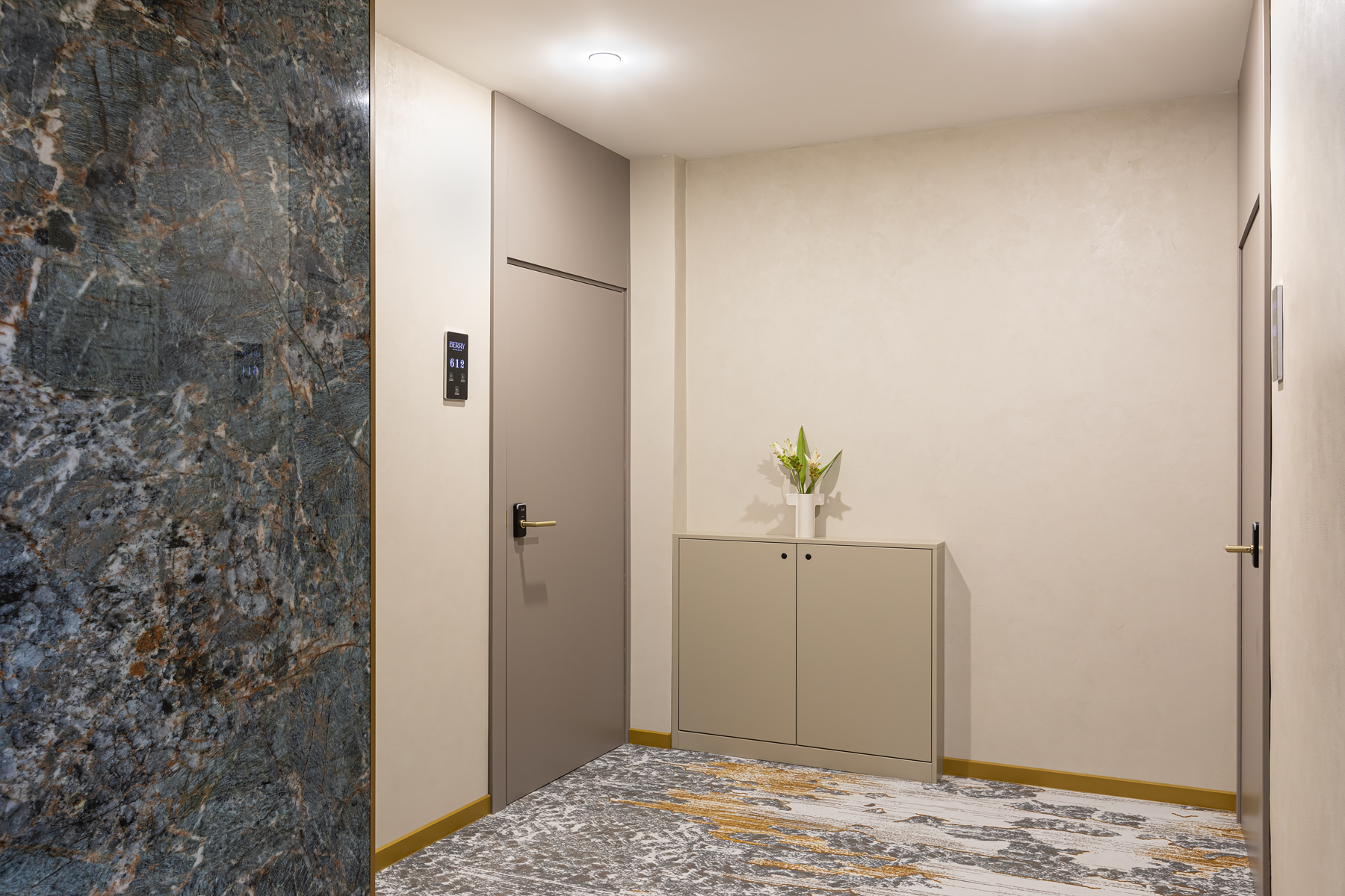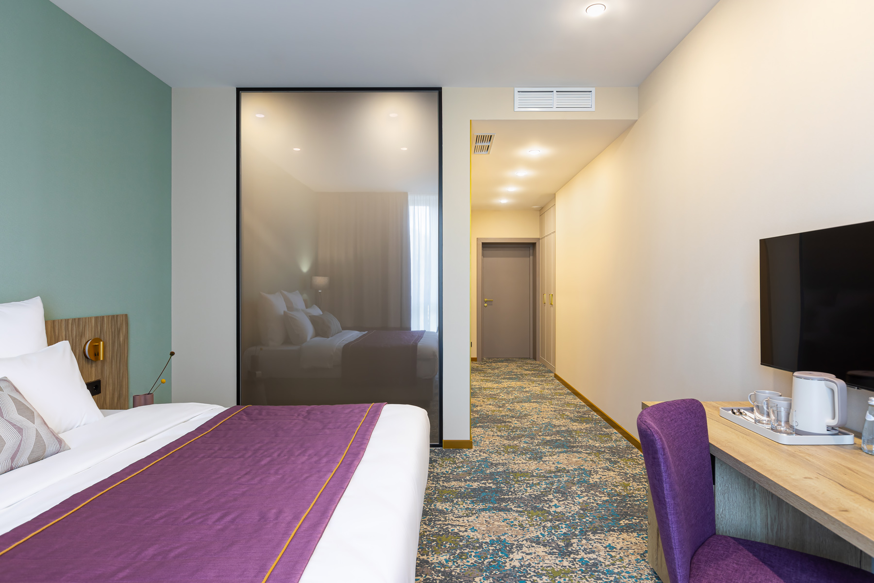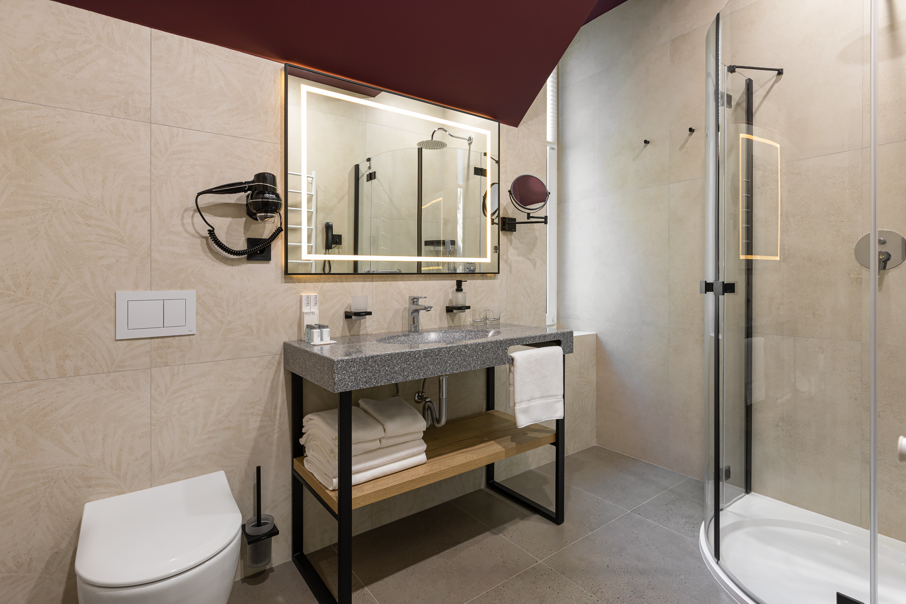 BERRY HOTEL & SPA 4* — не первый мой проект отеля, и я горжусь тем, что за свою карьеру мне удалось поработать с несколькими подобными пространствами. В этот раз мне предстояло создать масштабный дизайн-проект для отеля общей площадью около 4 000 кв. м — 6 этажей, 42 номера. Само название отеля — BERRY — диктует общий концепт, рождает различные ассоциации. Тем не менее мне хотелось уйти от очевидных ягодных образов в интерьере. Обыграть «природное» название удалось с помощью глубоких, насыщенных оттенков в интерьере; «ягодные» ассоциации поддерживает имитация лукошка — на ресепшене и в зоне барной стойки, а также стилизация потолка, напоминающего проступающий сквозь древесную листву свет, — в лобби.