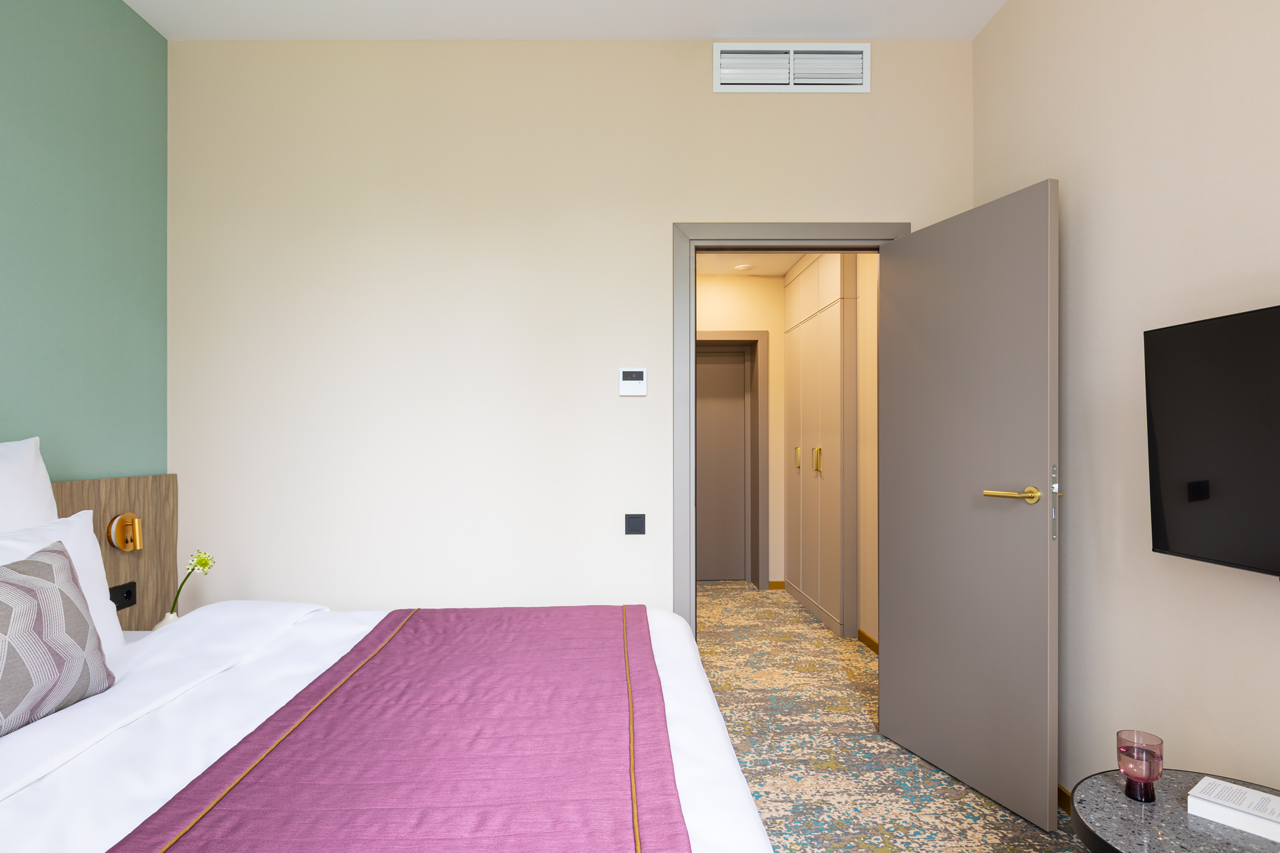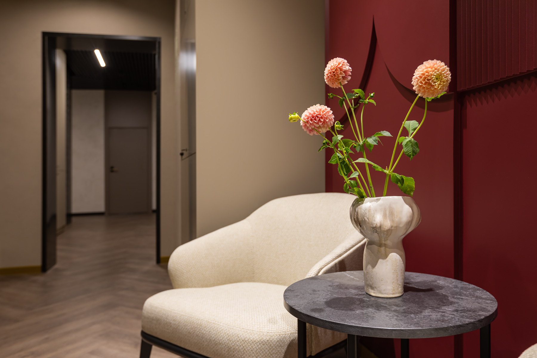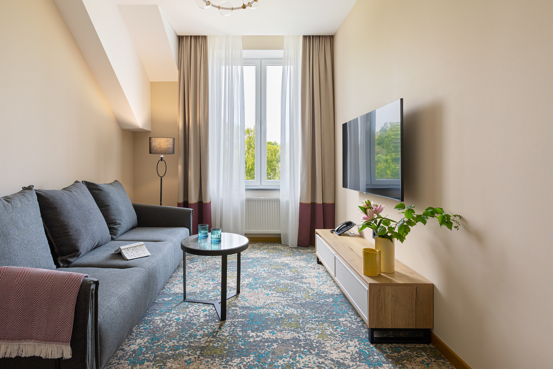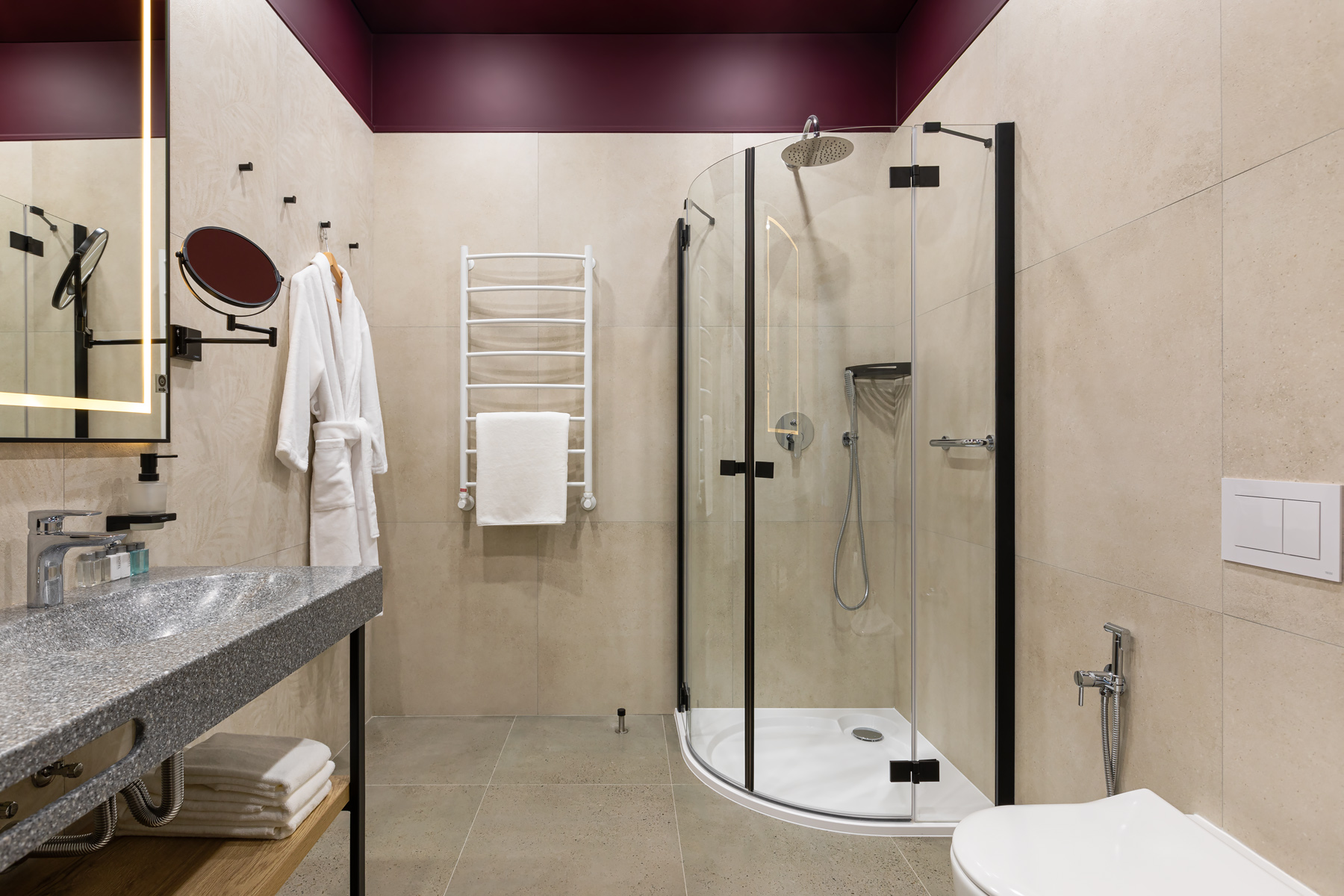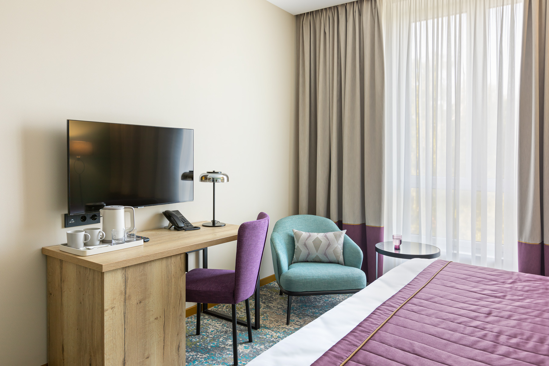 BERRY HOTEL & SPA 4* — не первый мой проект отеля, и я горжусь тем, что за свою карьеру мне удалось поработать с несколькими подобными пространствами. В этот раз мне предстояло создать масштабный дизайн-проект для отеля общей площадью около 4 000 кв. м — 6 этажей, 42 номера. Само название отеля — BERRY — диктует общий концепт, рождает различные ассоциации. Тем не менее мне хотелось уйти от очевидных ягодных образов в интерьере. Обыграть «природное» название удалось с помощью глубоких, насыщенных оттенков в интерьере; «ягодные» ассоциации поддерживает имитация лукошка — на ресепшене и в зоне барной стойки, а также стилизация потолка, напоминающего проступающий сквозь древесную листву свет, — в лобби.