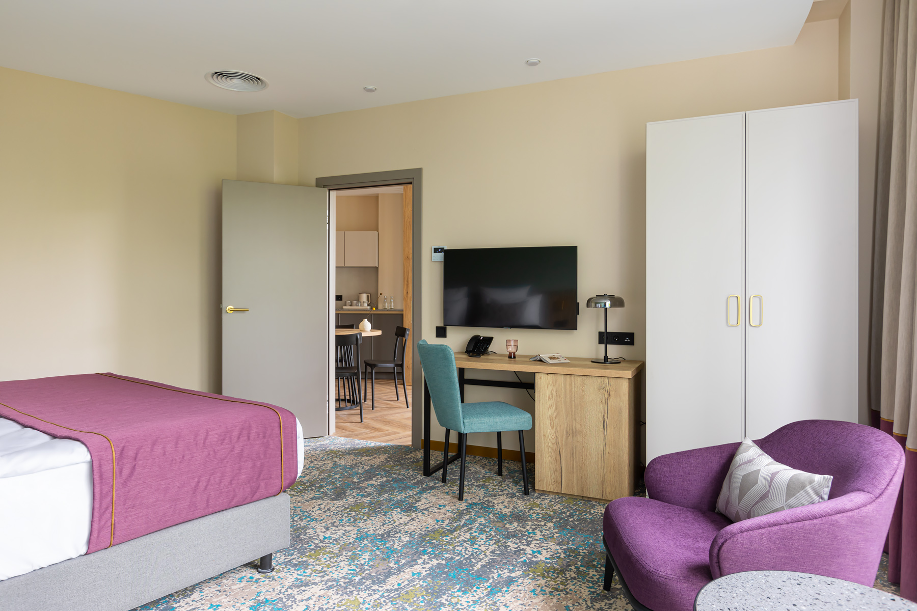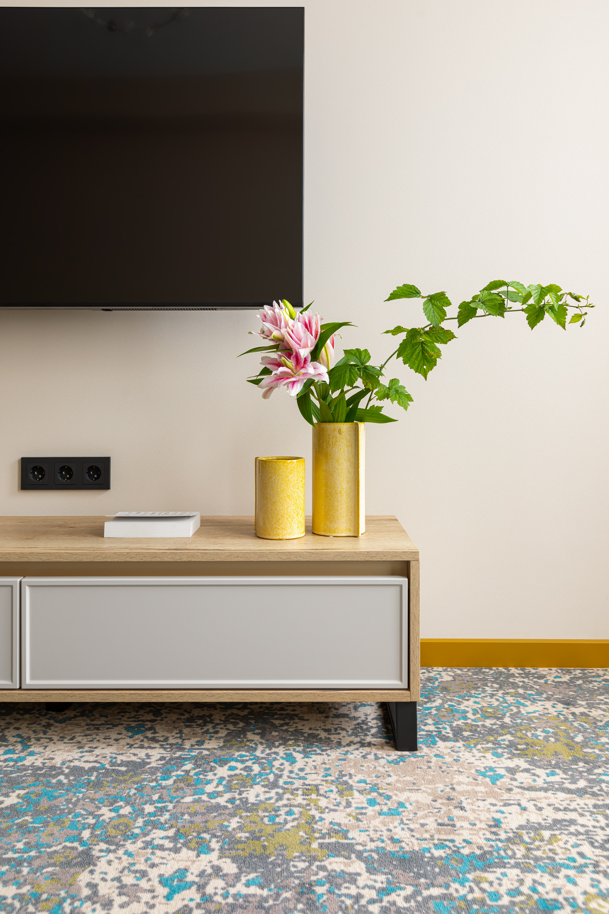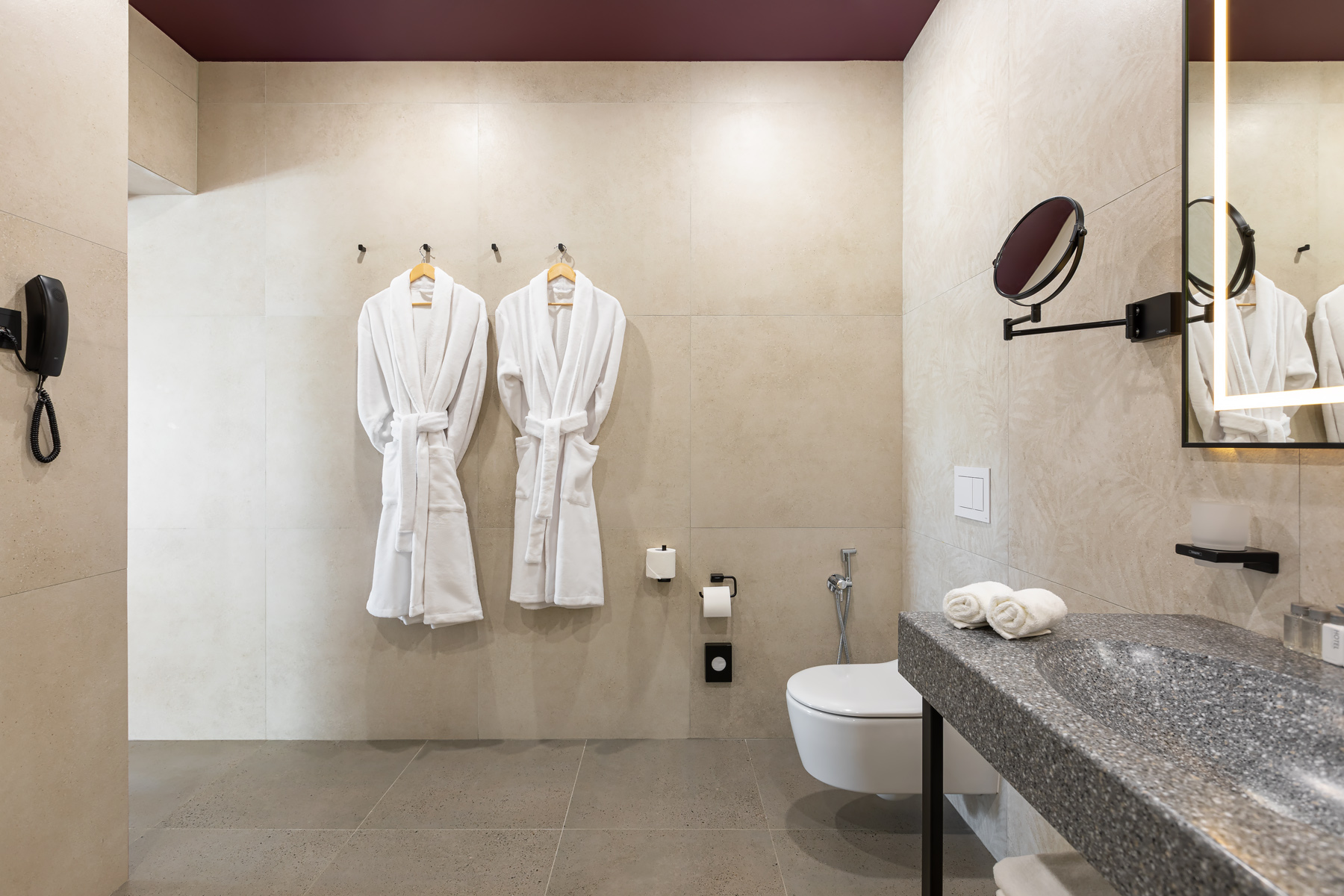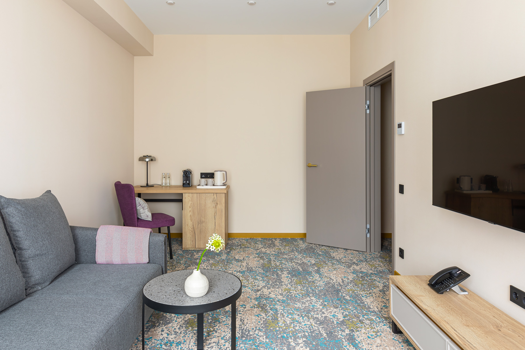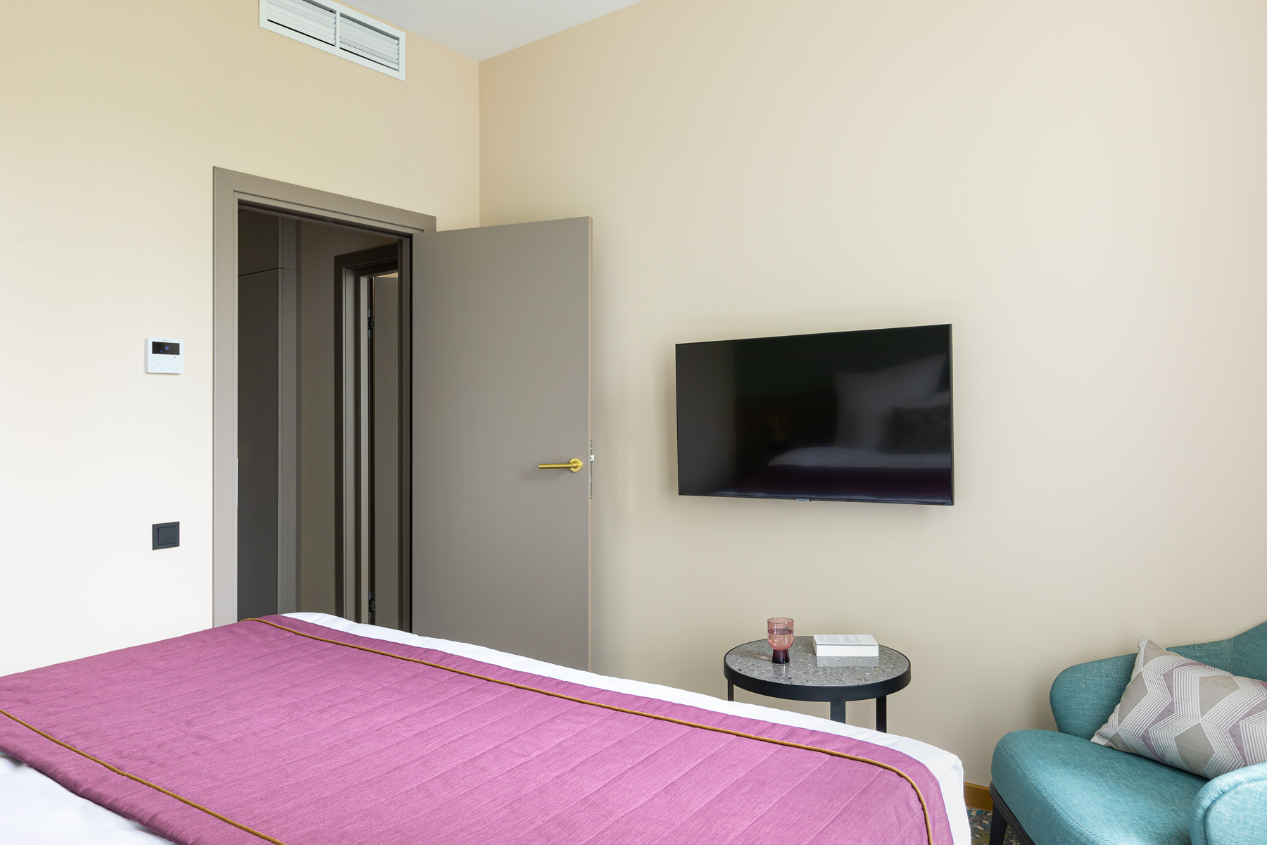 BERRY HOTEL & SPA 4* — не первый мой проект отеля, и я горжусь тем, что за свою карьеру мне удалось поработать с несколькими подобными пространствами. В этот раз мне предстояло создать масштабный дизайн-проект для отеля общей площадью около 4 000 кв. м — 6 этажей, 42 номера. Само название отеля — BERRY — диктует общий концепт, рождает различные ассоциации. Тем не менее мне хотелось уйти от очевидных ягодных образов в интерьере. Обыграть «природное» название удалось с помощью глубоких, насыщенных оттенков в интерьере; «ягодные» ассоциации поддерживает имитация лукошка — на ресепшене и в зоне барной стойки, а также стилизация потолка, напоминающего проступающий сквозь древесную листву свет, — в лобби.