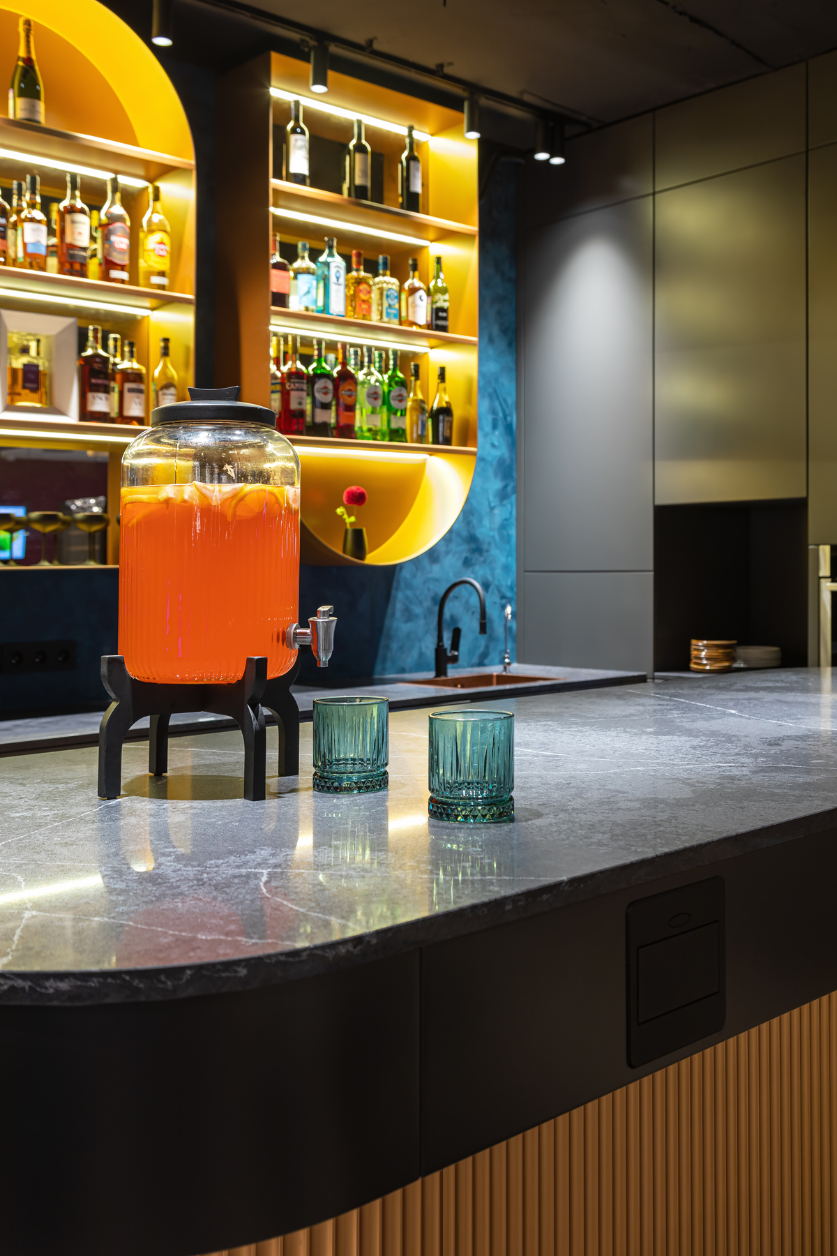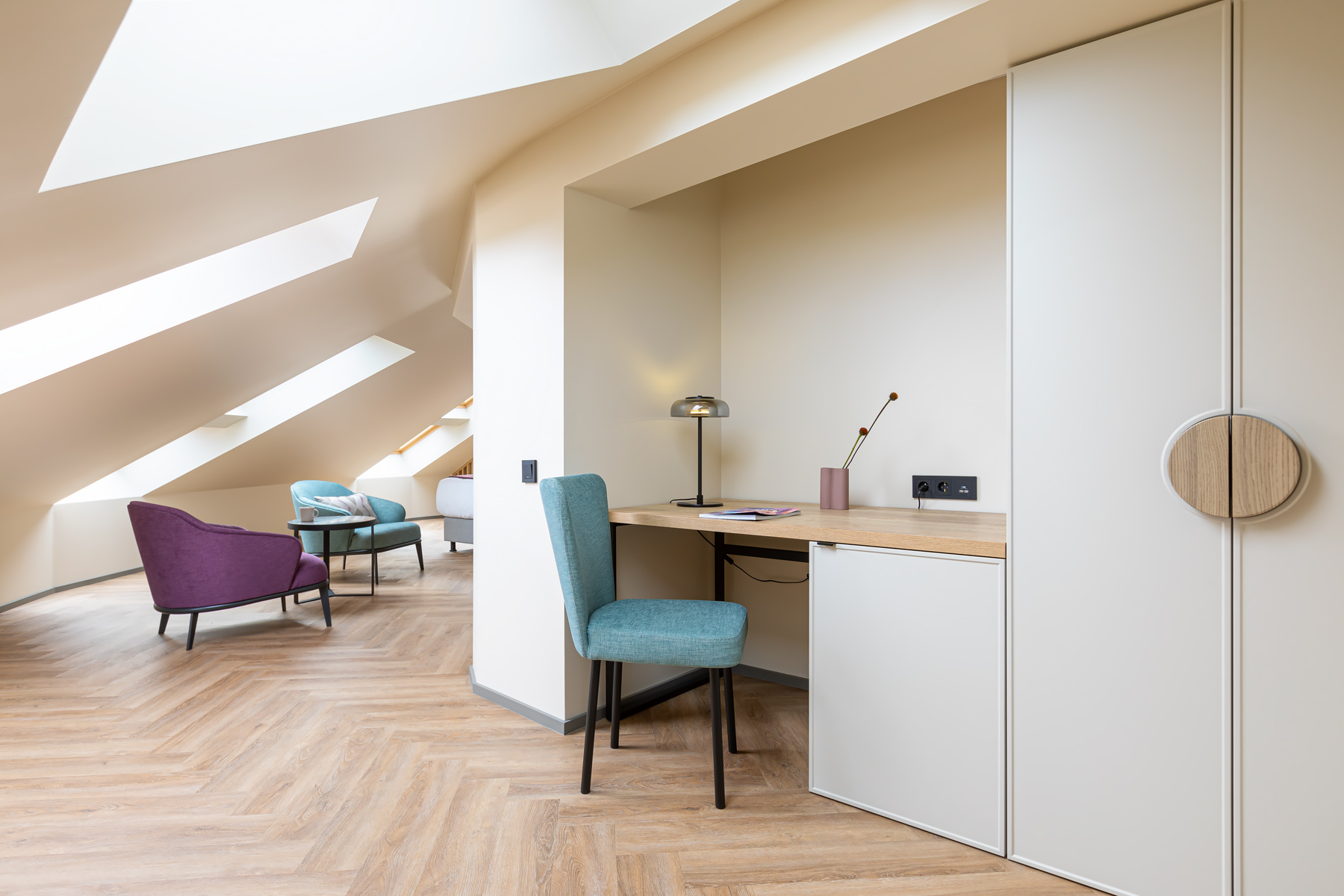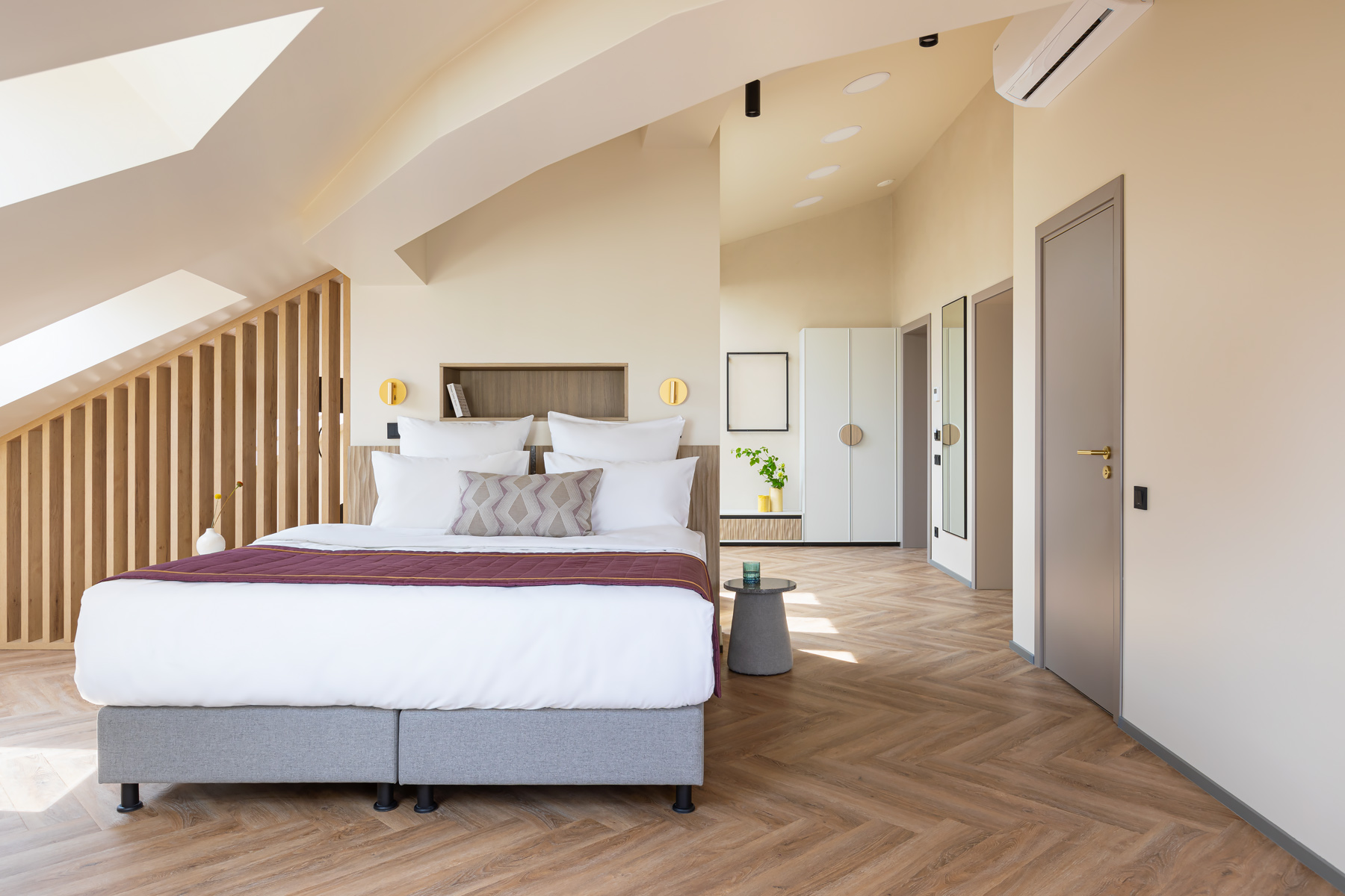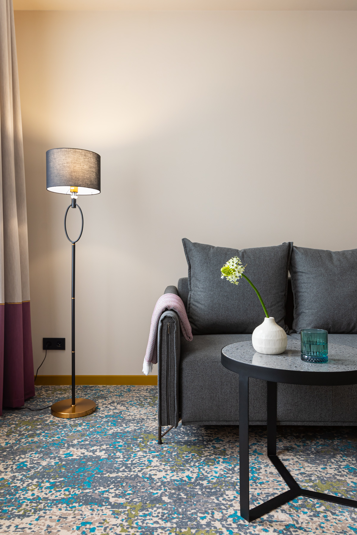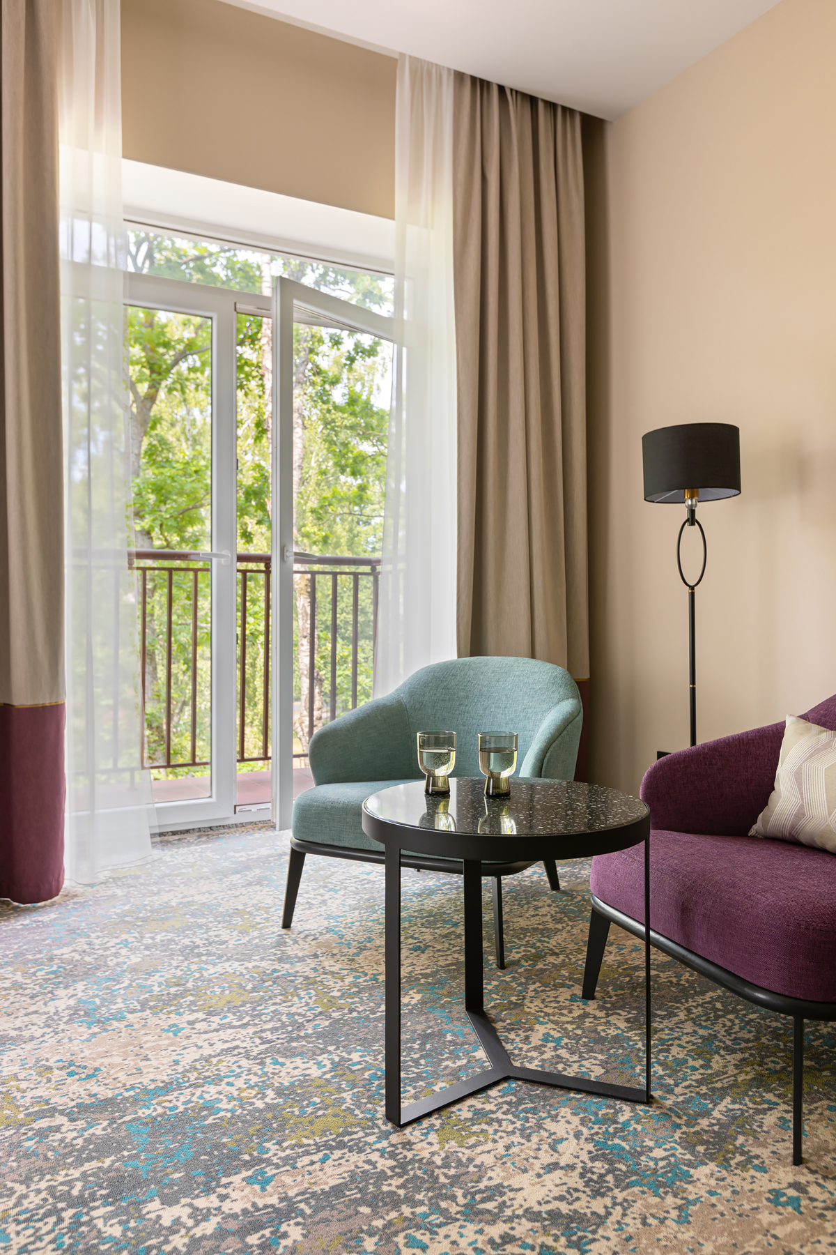 BERRY HOTEL & SPA 4* — не первый мой проект отеля, и я горжусь тем, что за свою карьеру мне удалось поработать с несколькими подобными пространствами. В этот раз мне предстояло создать масштабный дизайн-проект для отеля общей площадью около 4 000 кв. м — 6 этажей, 42 номера. Само название отеля — BERRY — диктует общий концепт, рождает различные ассоциации. Тем не менее мне хотелось уйти от очевидных ягодных образов в интерьере. Обыграть «природное» название удалось с помощью глубоких, насыщенных оттенков в интерьере; «ягодные» ассоциации поддерживает имитация лукошка — на ресепшене и в зоне барной стойки, а также стилизация потолка, напоминающего проступающий сквозь древесную листву свет, — в лобби.