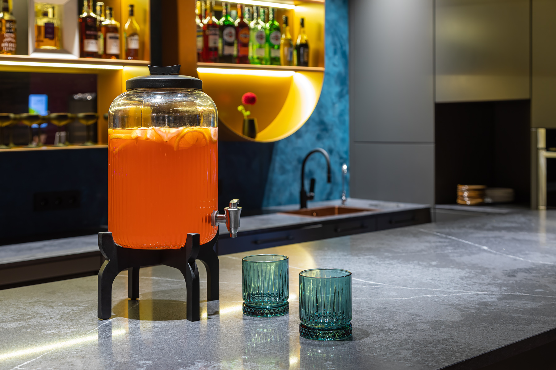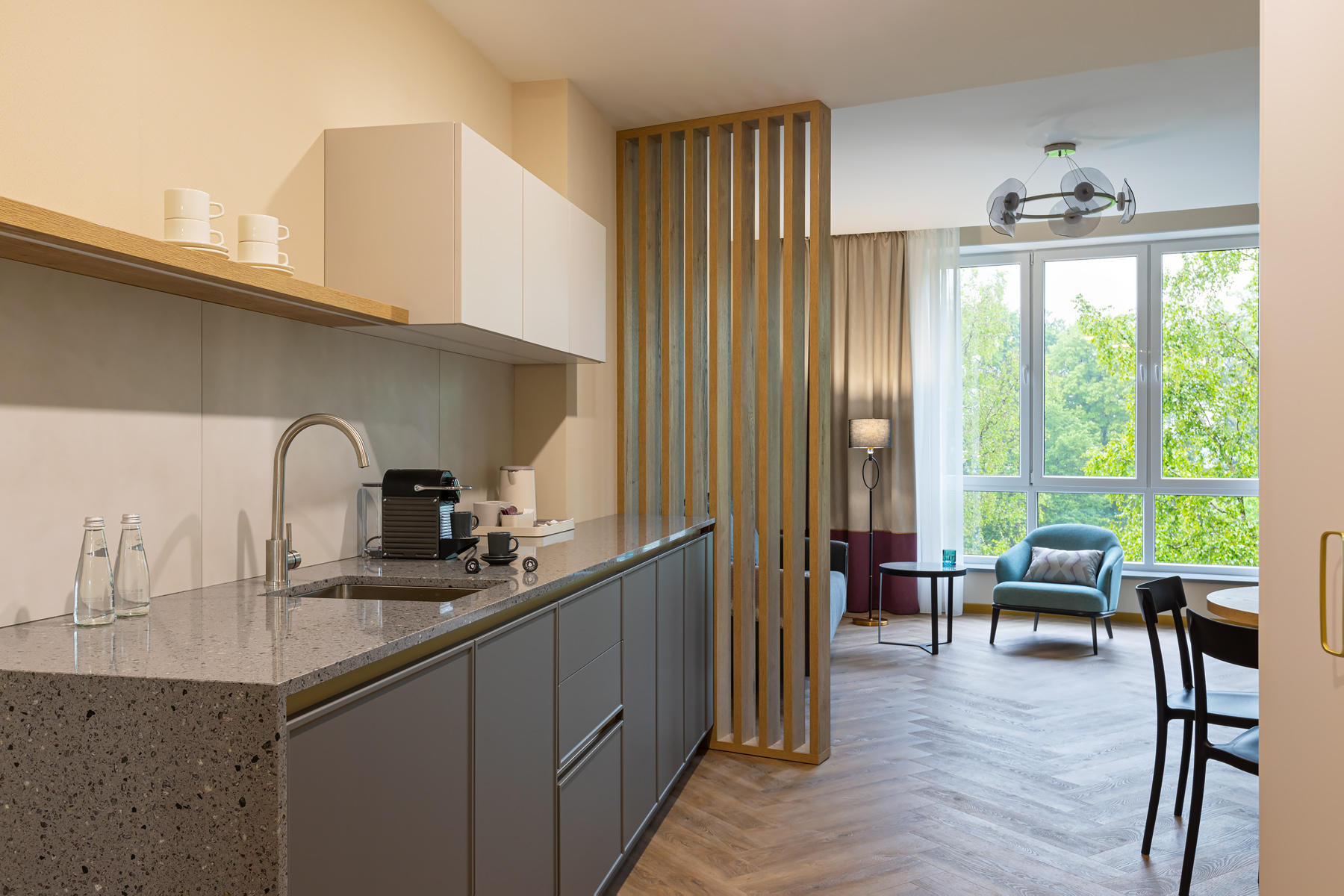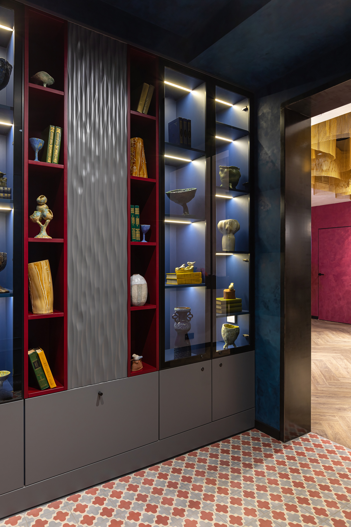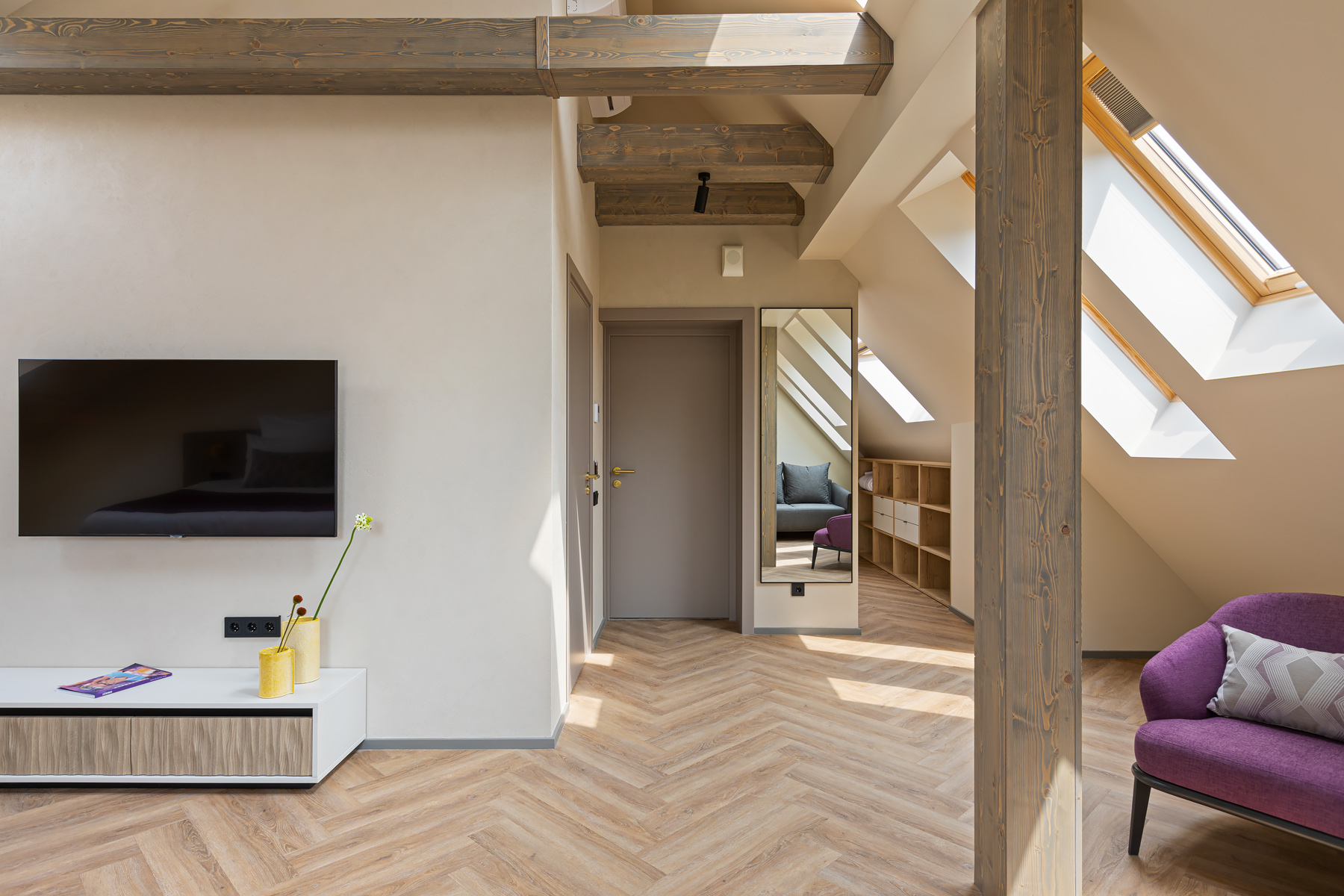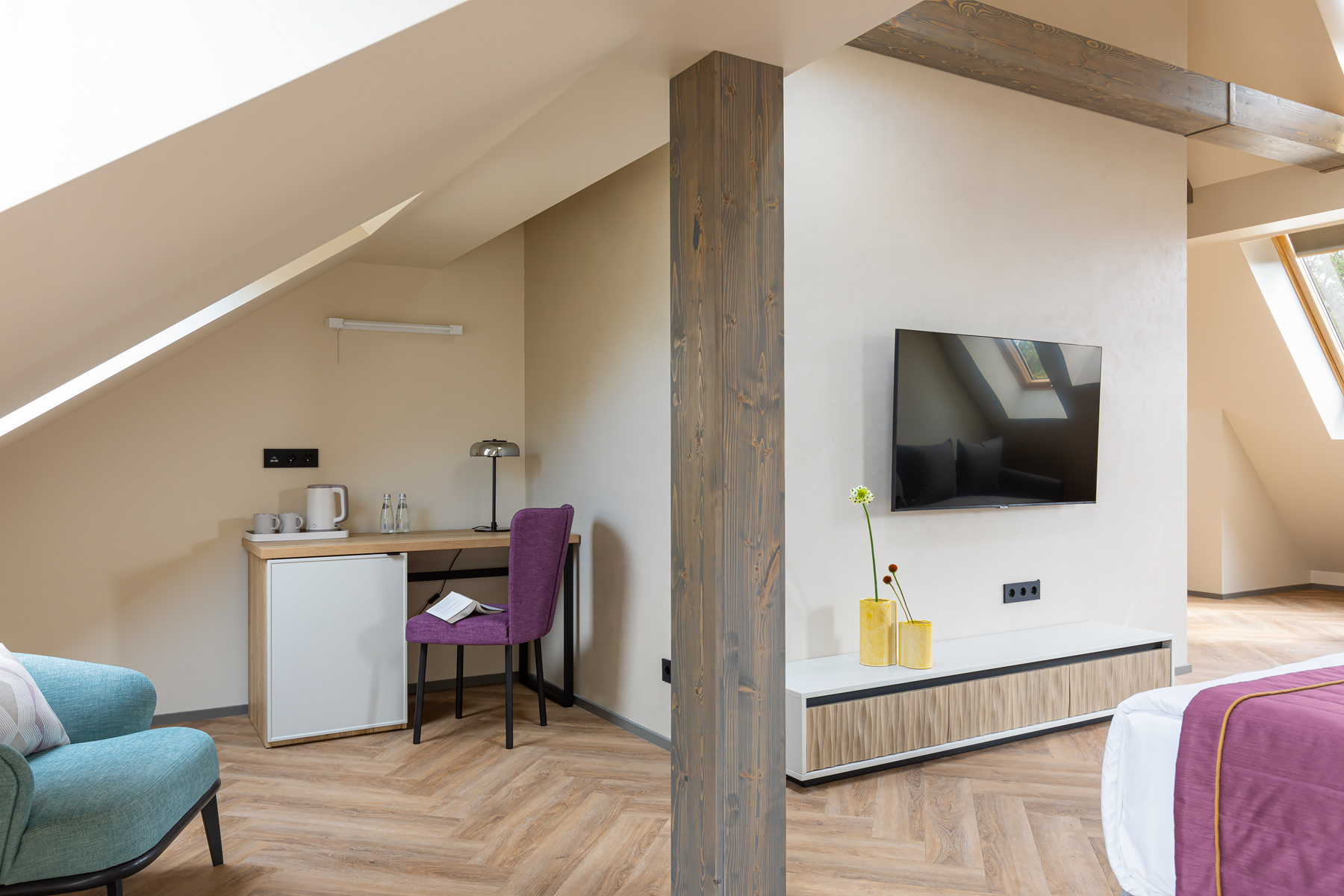 BERRY HOTEL & SPA 4* — не первый мой проект отеля, и я горжусь тем, что за свою карьеру мне удалось поработать с несколькими подобными пространствами. В этот раз мне предстояло создать масштабный дизайн-проект для отеля общей площадью около 4 000 кв. м — 6 этажей, 42 номера. Само название отеля — BERRY — диктует общий концепт, рождает различные ассоциации. Тем не менее мне хотелось уйти от очевидных ягодных образов в интерьере. Обыграть «природное» название удалось с помощью глубоких, насыщенных оттенков в интерьере; «ягодные» ассоциации поддерживает имитация лукошка — на ресепшене и в зоне барной стойки, а также стилизация потолка, напоминающего проступающий сквозь древесную листву свет, — в лобби.