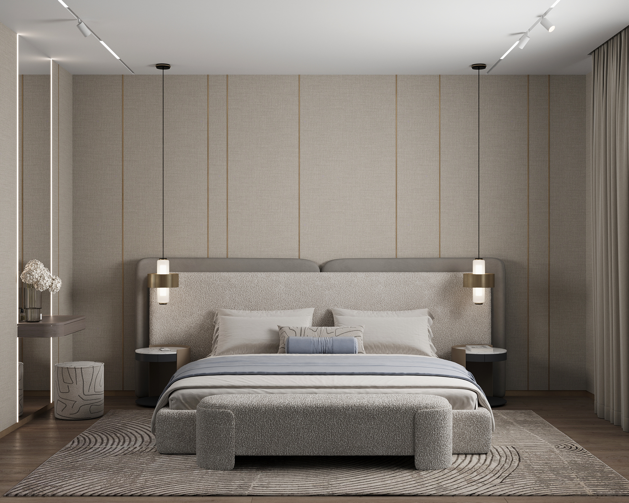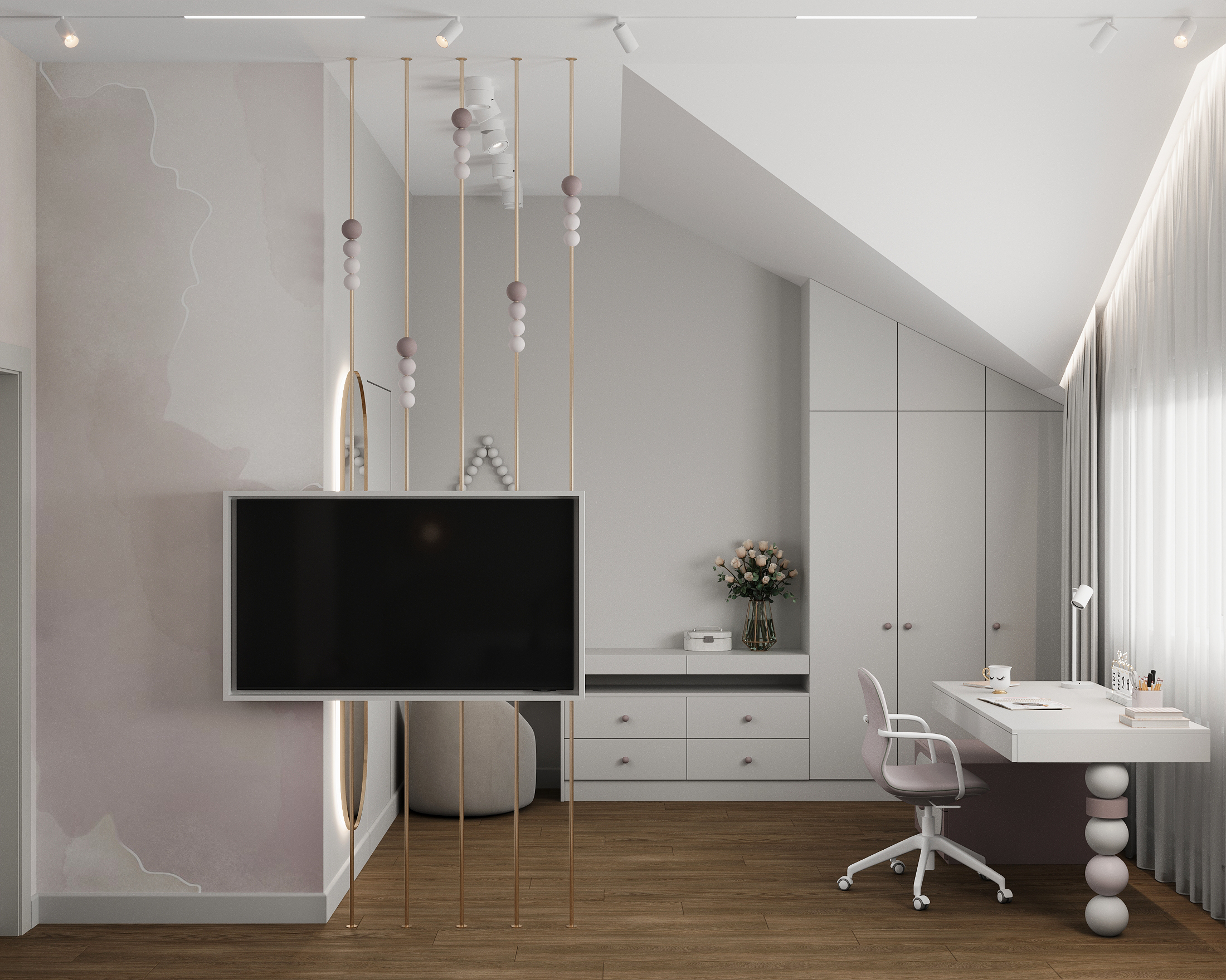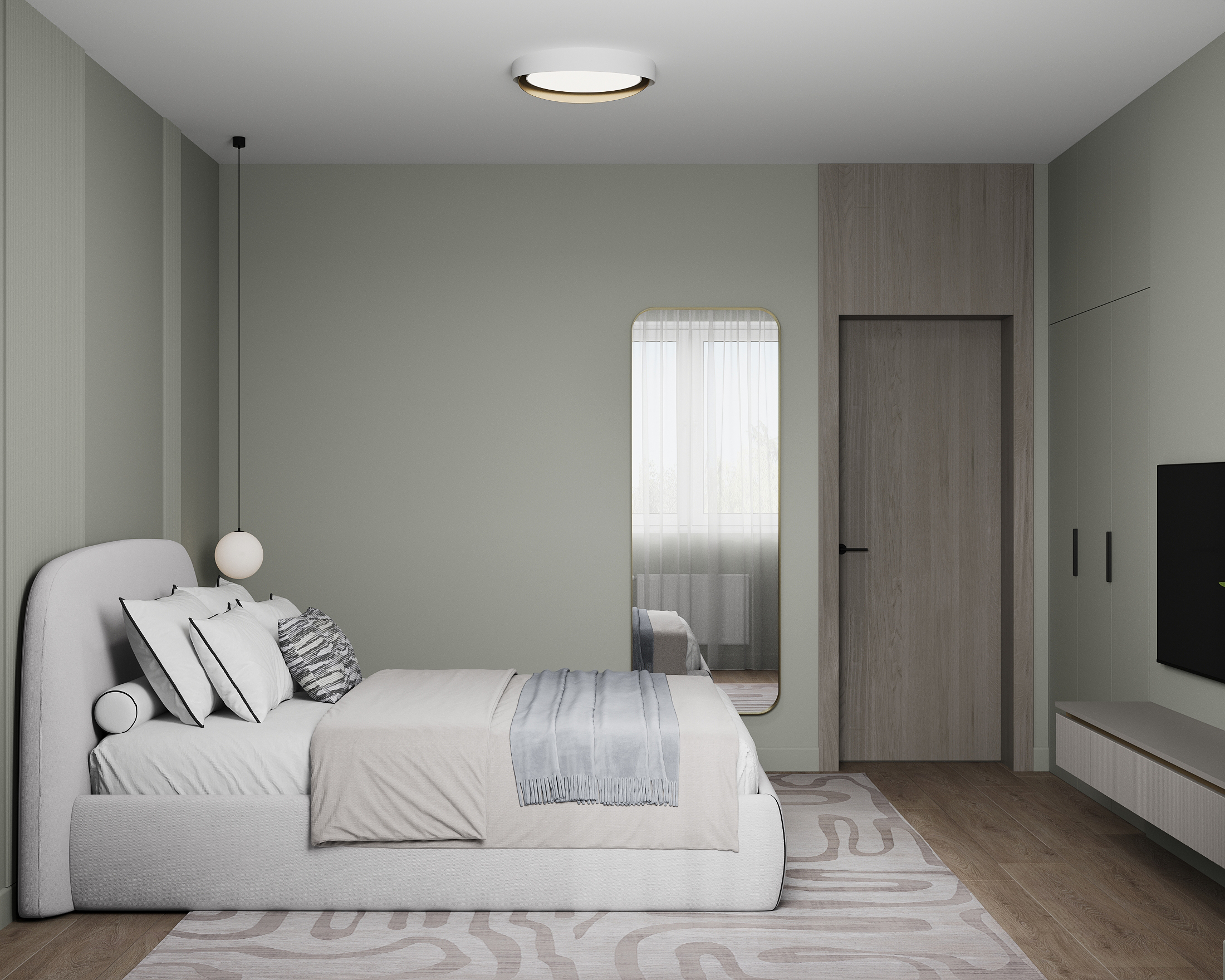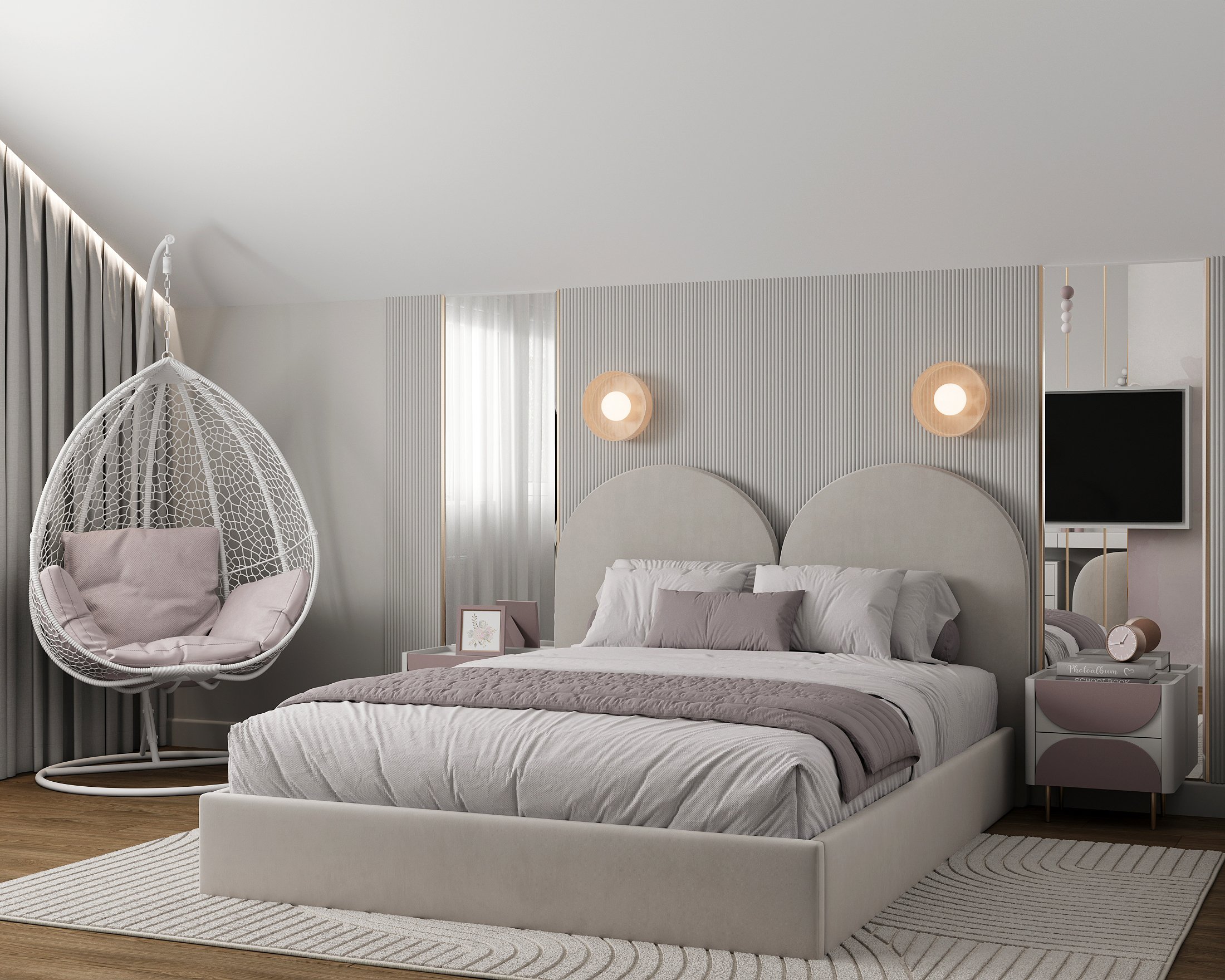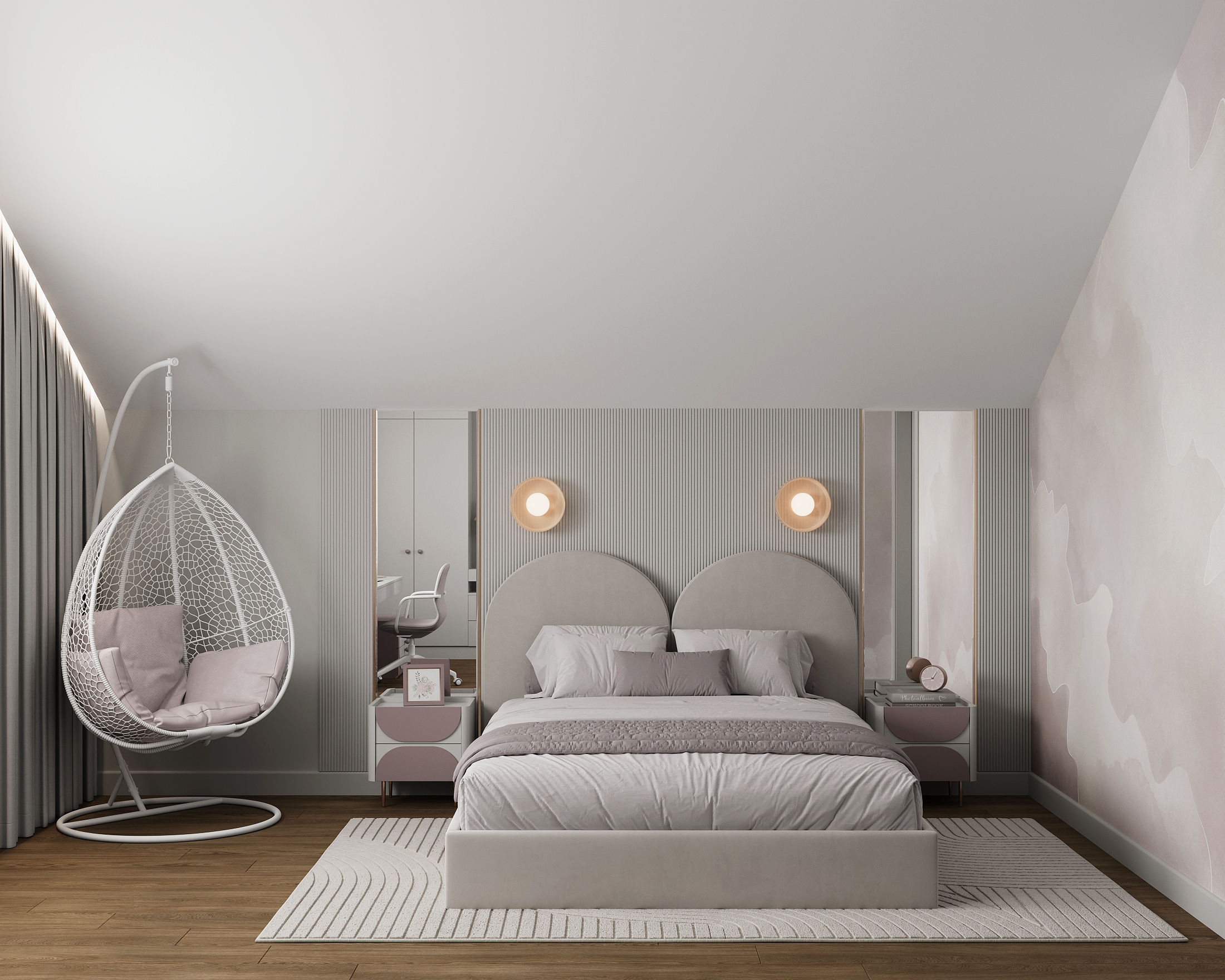 Современный скандинавский микс с японским ваби-саби. Акцент на естественных материалах, чистом воздухе, обилии света , обтекаемых формах и продуманных системах хранения, которые прячут детскую активность, сохраняя визуальный покой. Цель — создать уютное, «обволакивающее» гнездышко, где легко дышится и родителям, и детям.