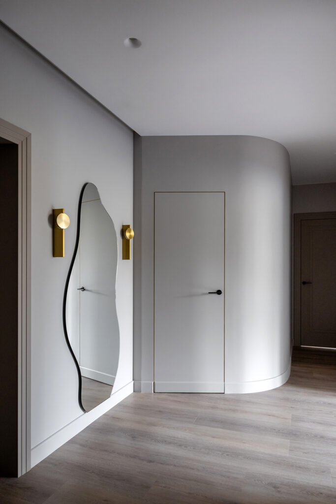 Впрочем, был и ещё один фактор, повлиявший на стилистику: перепланировка в квартире была невозможна. Екатерине Герасимовой пришлось работать в предлагаемых обстоятельствах и учитывать в проекте имеющуюся полукруглую стену.
