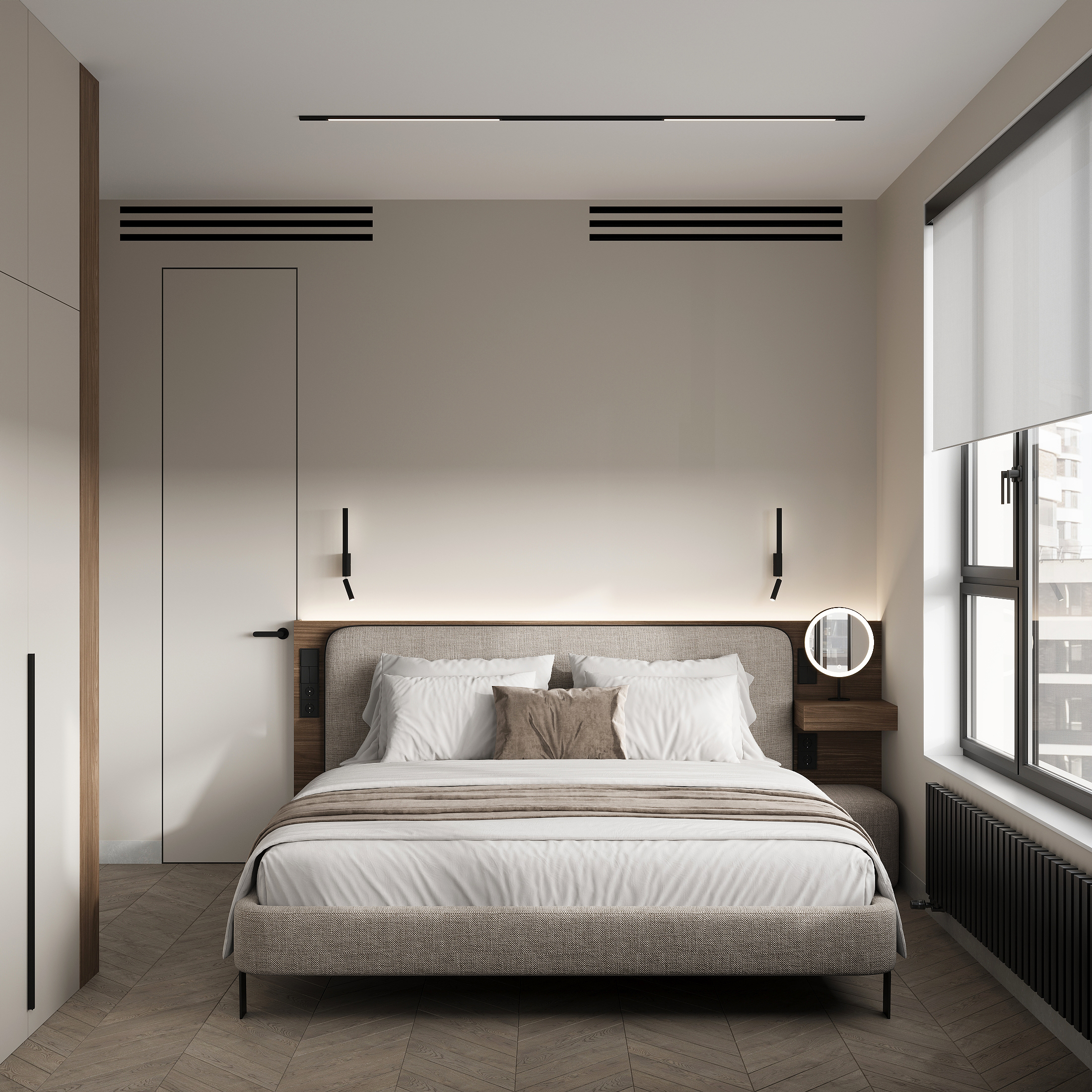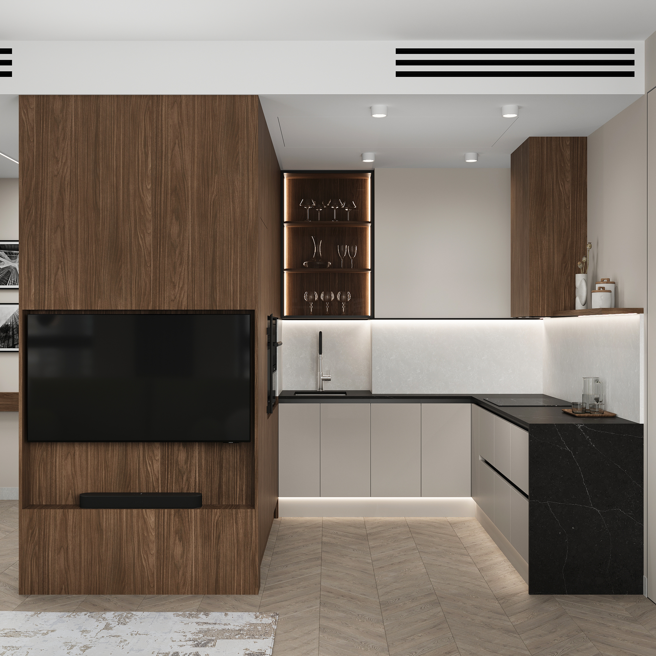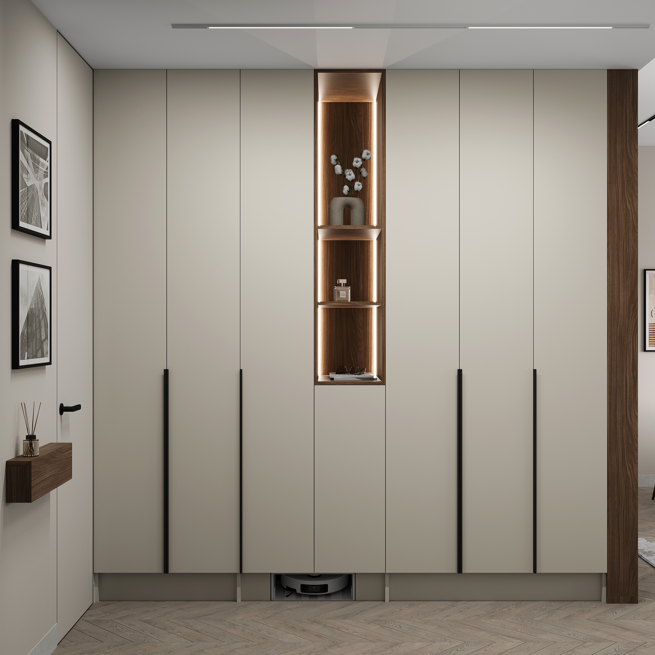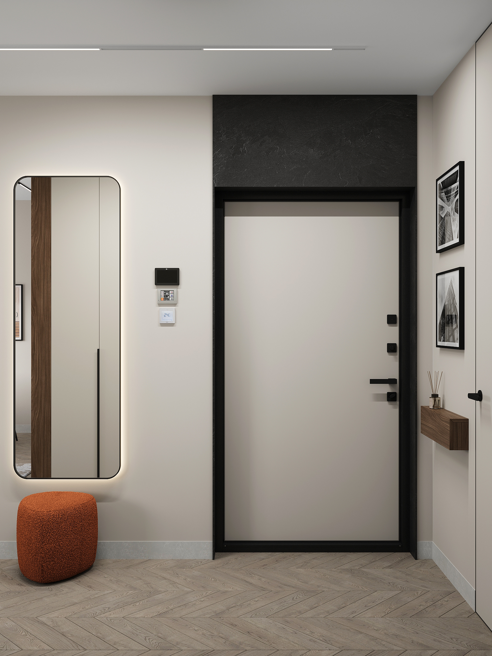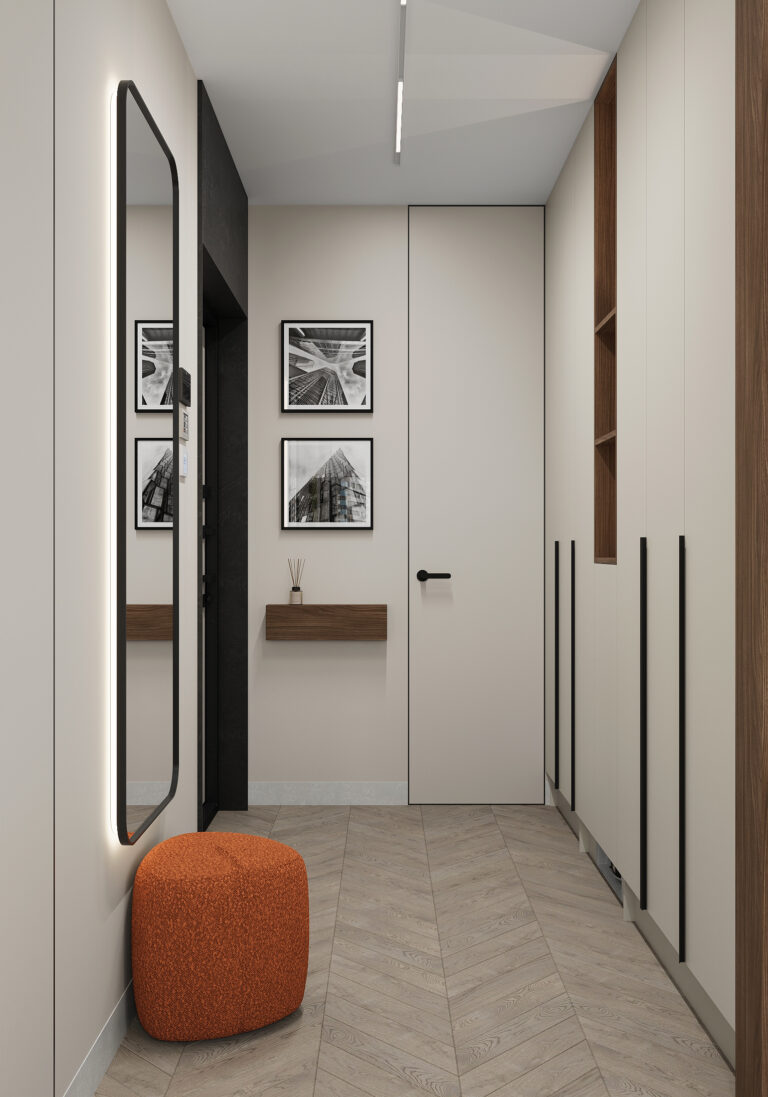 Квартира в «Символе» с её панорамными окнами и качественной отделкой — прекрасная основа. Мы получили не просто красивую квартиру в стиле минимализм, а высокотехнологичное, безопасное и максимально удобное пространство для жизни, где каждой вещи есть свое место, а интерьер будет расти и меняться вместе с вашей семьей. Сделан акцент на умных решениях, скрытом хранении и драматичном контрасте. Светлая, воздушная основа (стены, потолок, основной пол) как фон для насыщенных темных акцентов (кухонная столешница , мебельные фронты, трековое освещение). Вся мебель — многофункциональная и встроенная, техника — скрытая